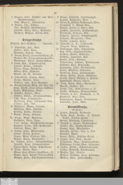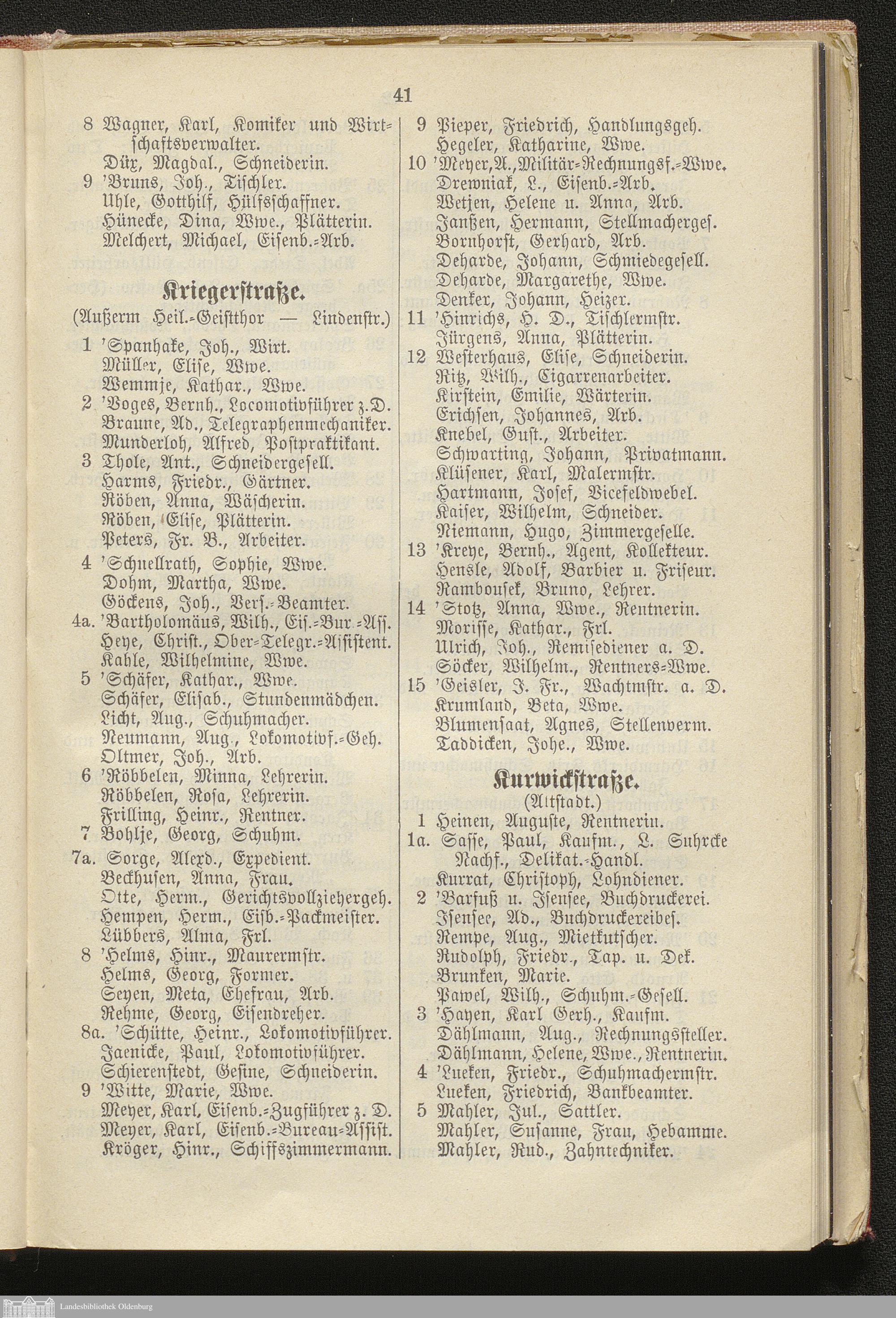 I. Alphabetisches Straßen-Verzeichnis der Residenzstadt Oldenburg, des Stadtgebietes Oldenburg, der Ortschaft Osternburg und eines Teils der Gemeinden Eversten und Ohmstede mit Angabe ihrer Bewohner, Behörden, öffentlichen Anstalten etc.