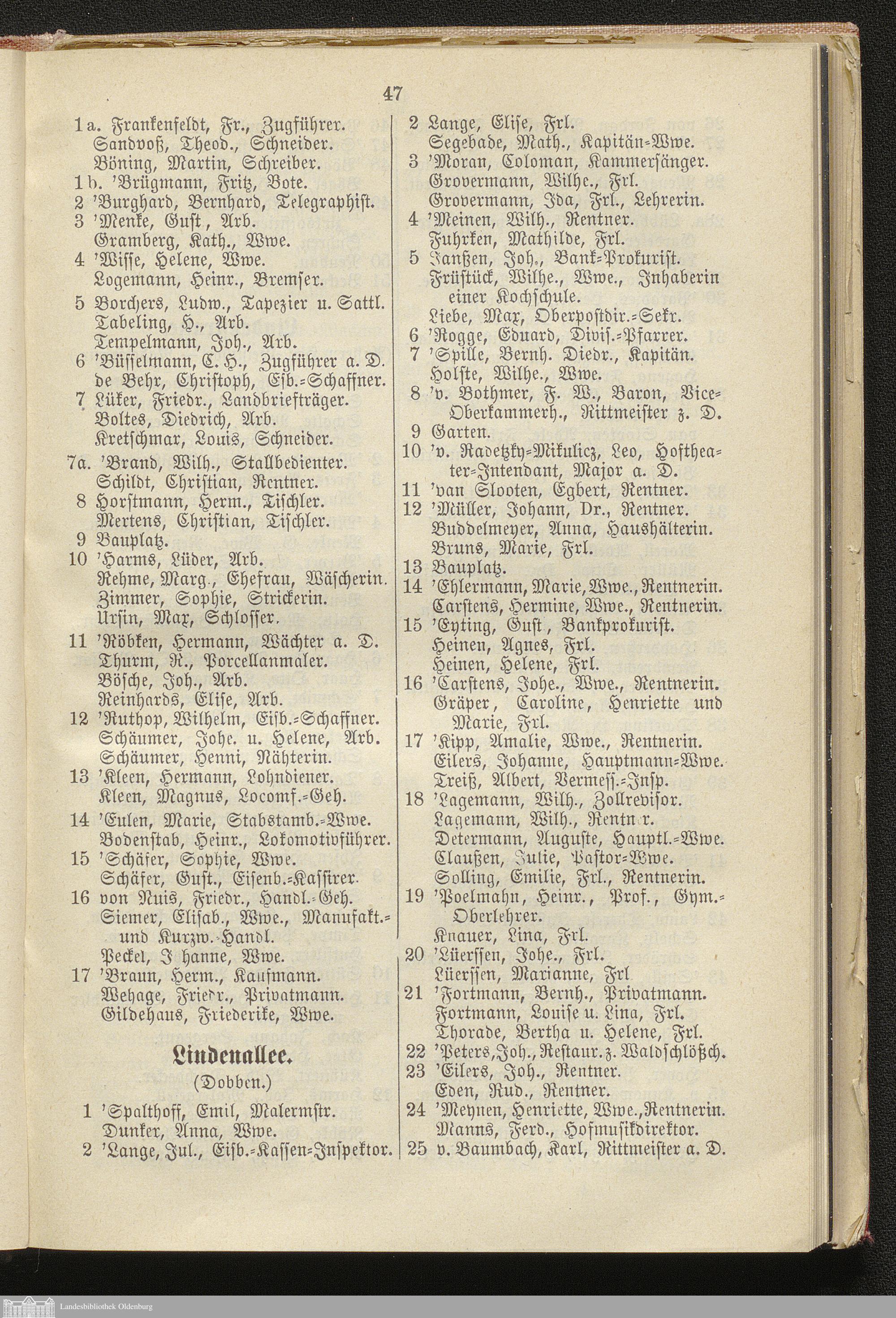 I. Alphabetisches Straßen-Verzeichnis der Residenzstadt Oldenburg, des Stadtgebietes Oldenburg, der Ortschaft Osternburg und eines Teils der Gemeinden Eversten und Ohmstede mit Angabe ihrer Bewohner, Behörden, öffentlichen Anstalten etc.