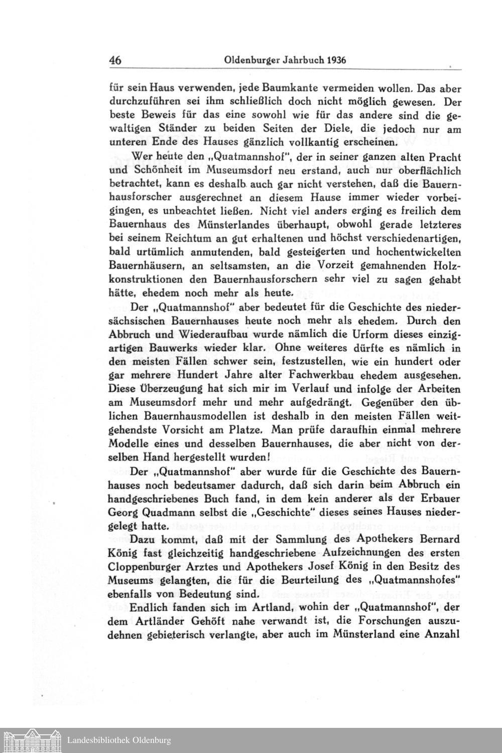 Die Wiedererrichtung des "Quatmannshofes" im Museumsdorf zu Cloppenburg. (Ein Beitrag zur Geschichte des niedersächsischen Bauernhauses. Von Heinrich Ottenjann.