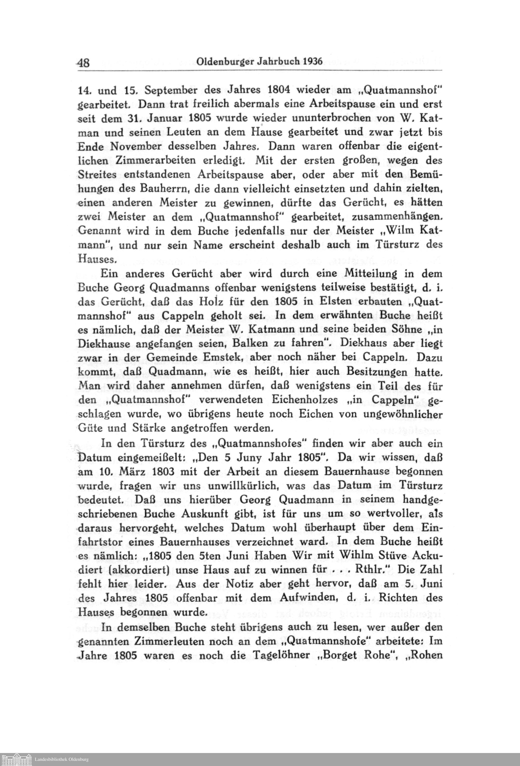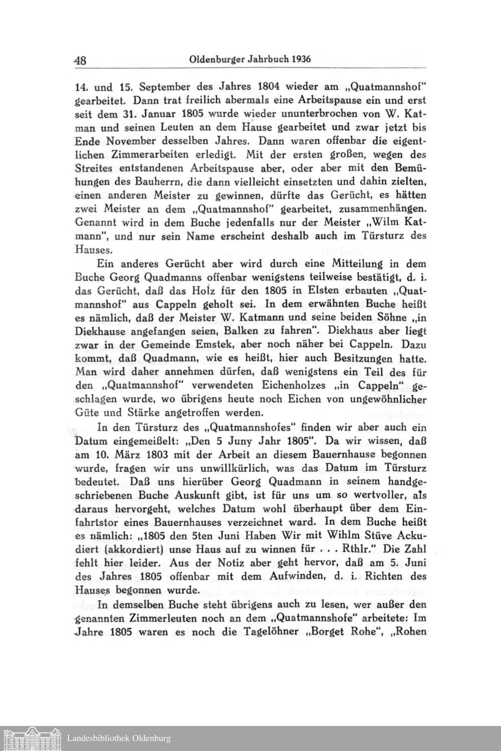 Die Wiedererrichtung des "Quatmannshofes" im Museumsdorf zu Cloppenburg. (Ein Beitrag zur Geschichte des niedersächsischen Bauernhauses. Von Heinrich Ottenjann.