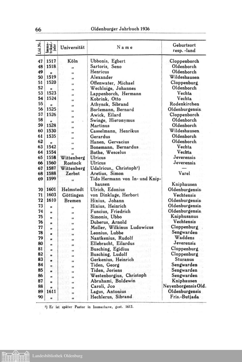 Oldenburger Studenten auf deutschen und außerdeutschen Hochschulen. Zweiter Nachtrag. Von Karl Sichart, Osnabrück.