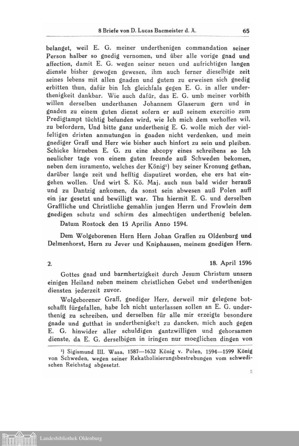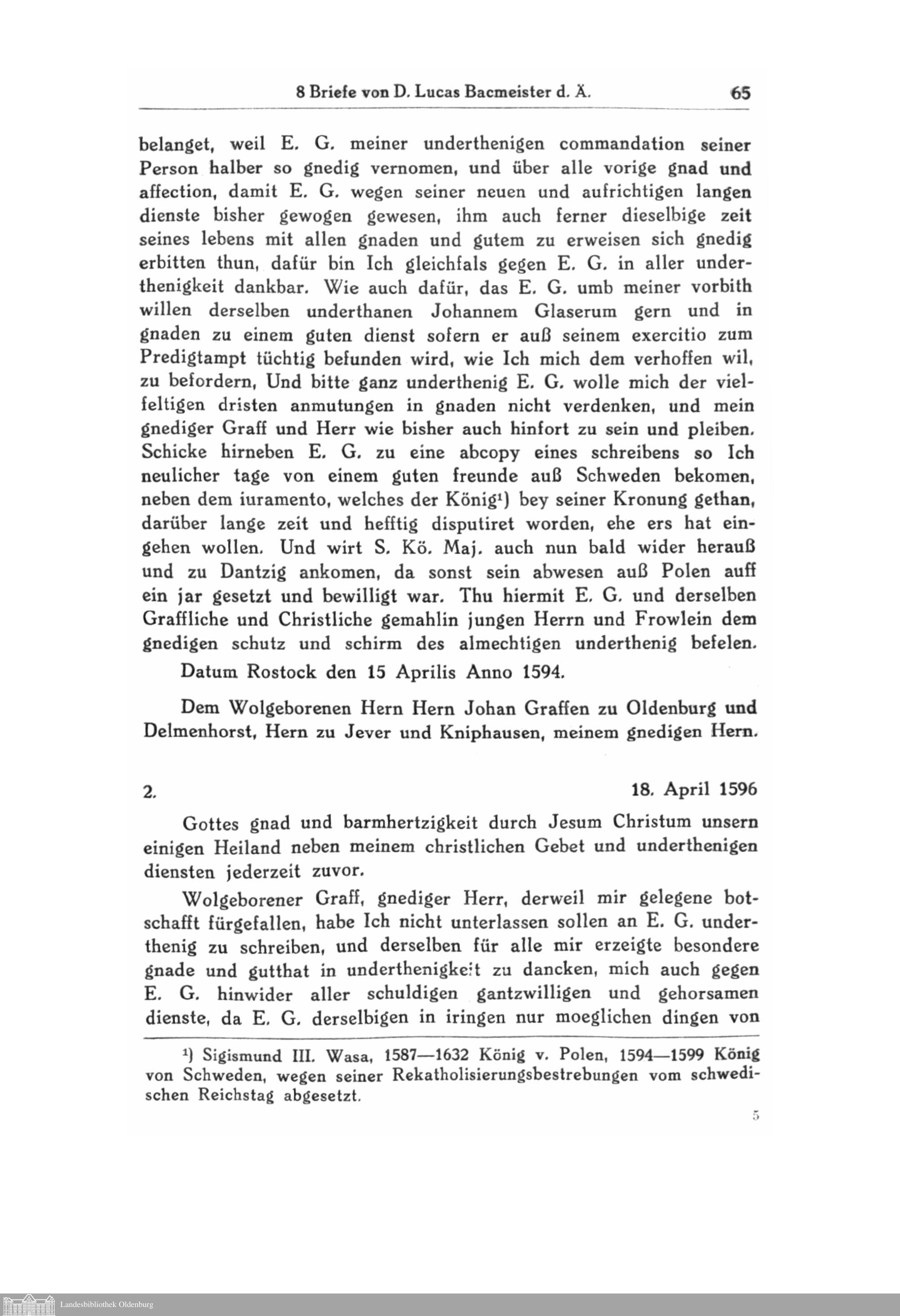 8 Briefe von D. Lucas Bacmeister d. Ä. an Graf Johann VII. von Oldenburg, 1594 – 1599 nebst Anhang: Politische Nachrichten an den Herzog Johann d. J. von Schleswig-Holstein 1581-1603. Mitgeteilt von Walther Bacmeister