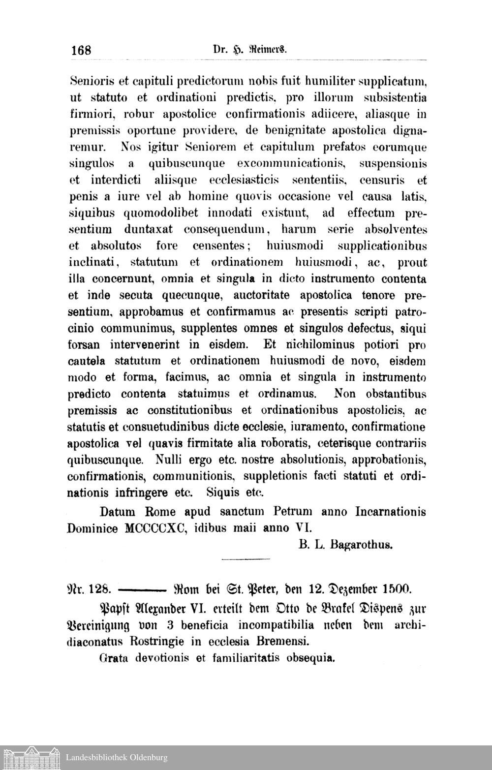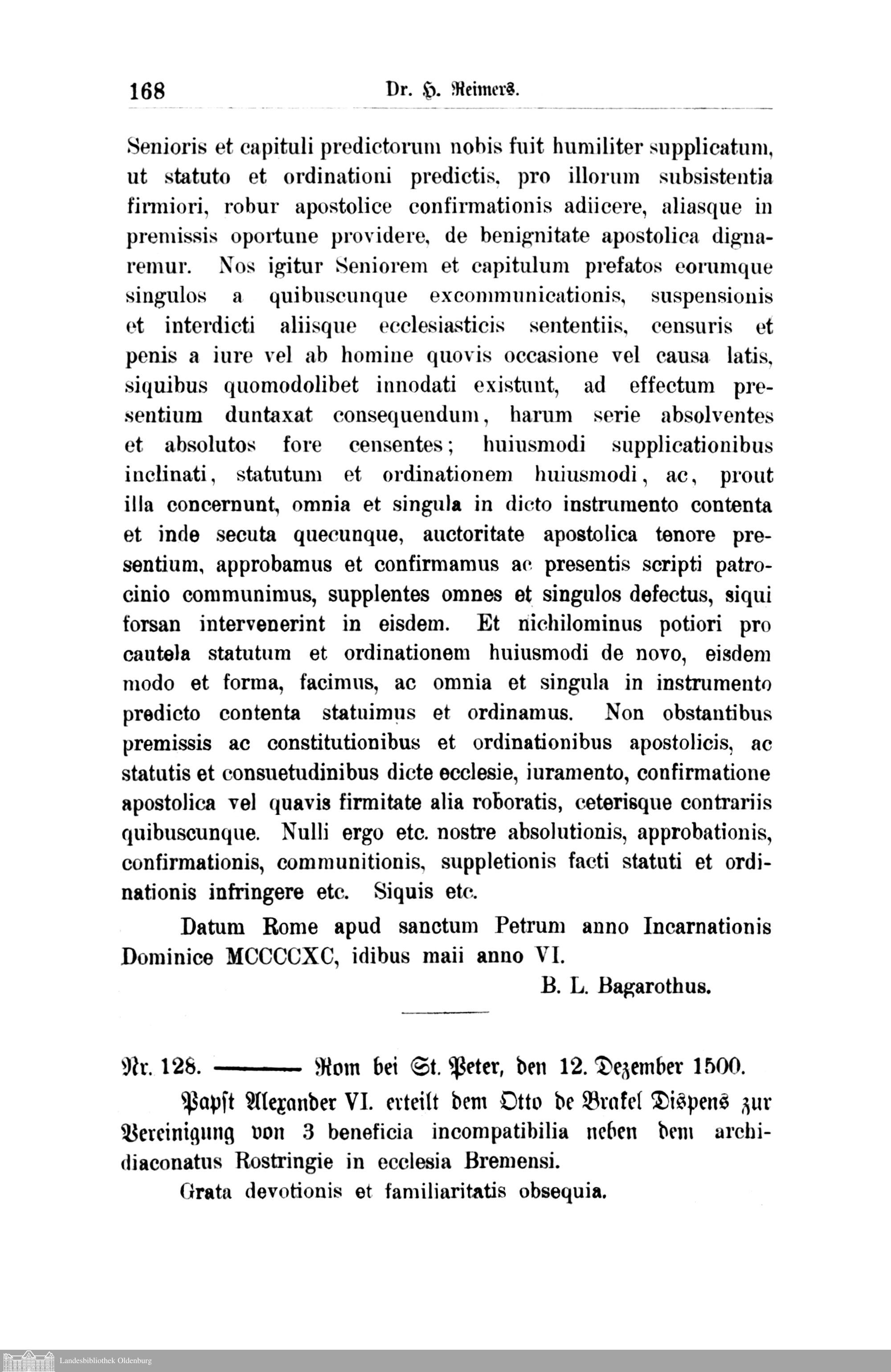 I. Oldenburgische Papsturkunden. Dr. H. Reimers in Aurich.