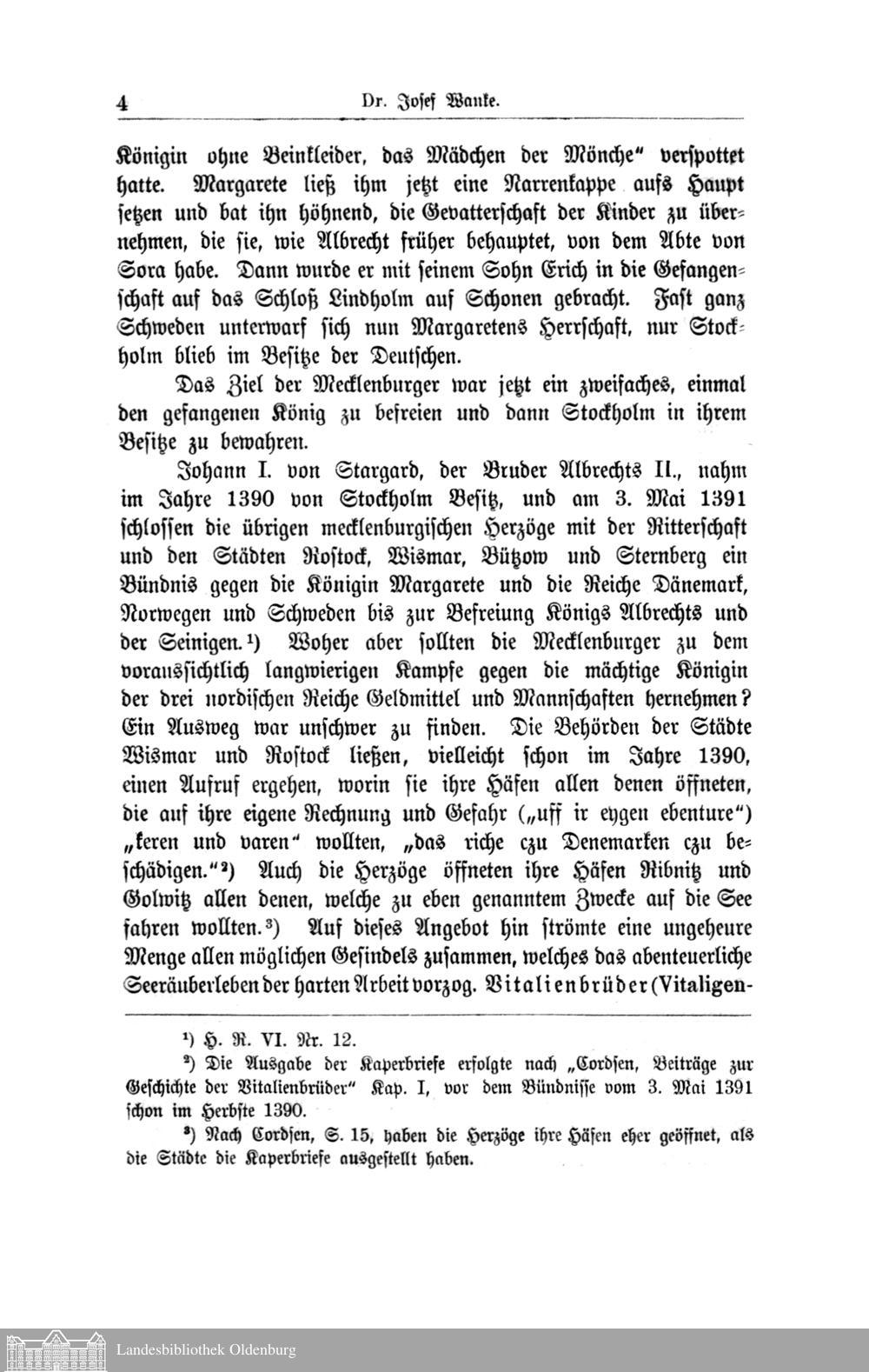 I. Die Vitalienbrüder in Oldenburg (1395 – 1433). Von Dr. Josef Wanke, Schnelten...