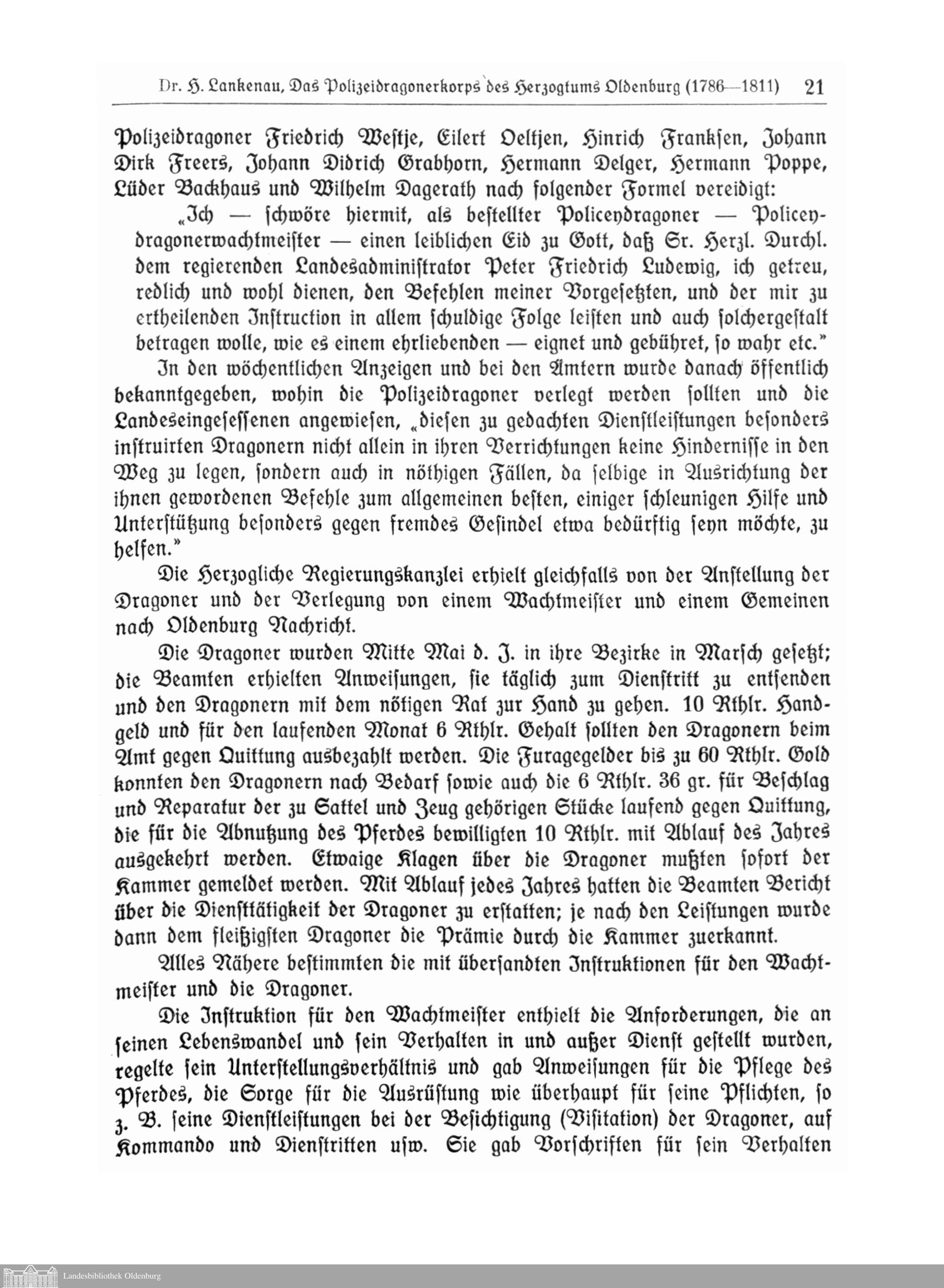 I. Das Polizeidragonerkorps des Herzogtums Odenburg (1786 – 1811). Die Geschichte des ältesten Verbandes der oldenburgischen staatlichen Polizei. Von Dr. Heinrich Lankenau, Polizeihauptmann, Oldenburg