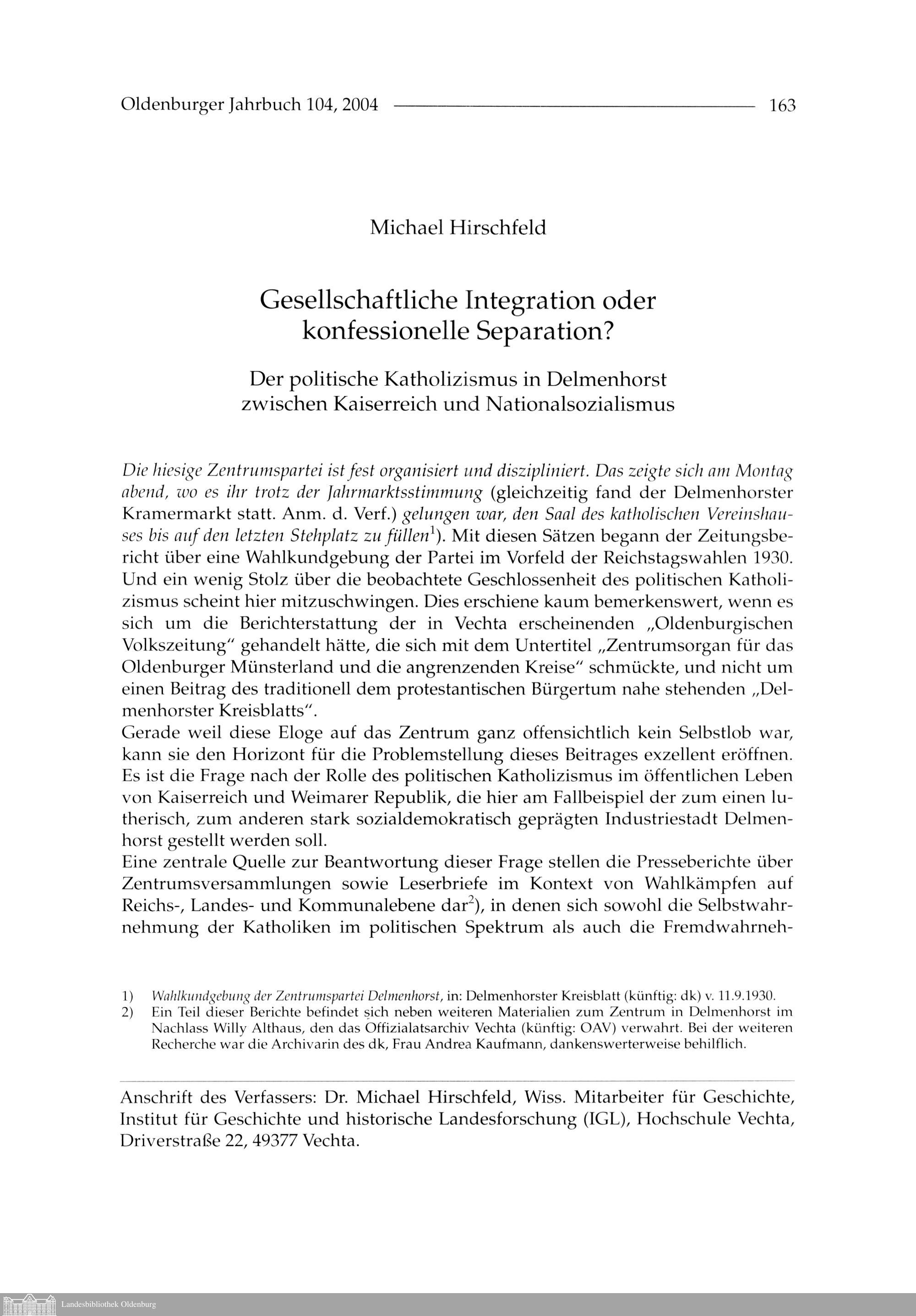 Michael Hirschfeld: Gesellschaftliche Integration oder konfessionelle Separation?...