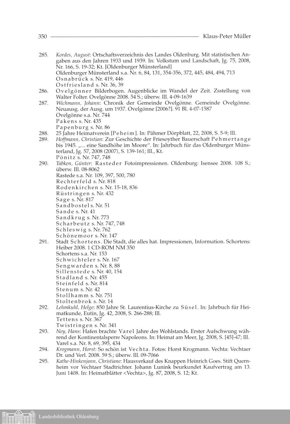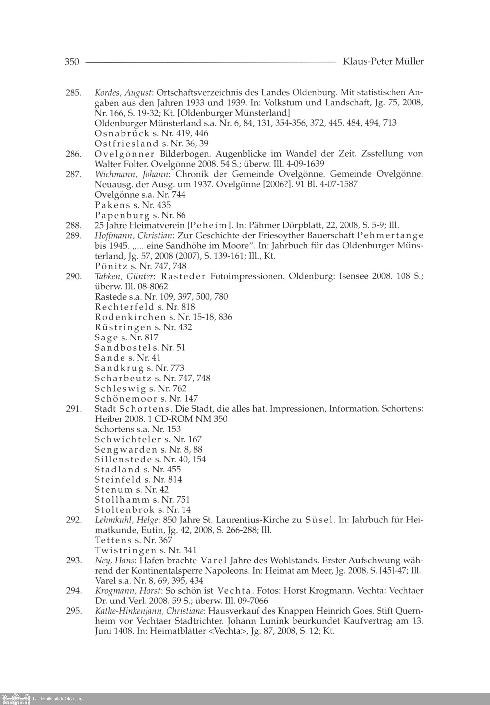 Klaus-Peter Müller: Oldenburgische Bibliographie 2008. Mit Nachträgen aus den vergangenen...
