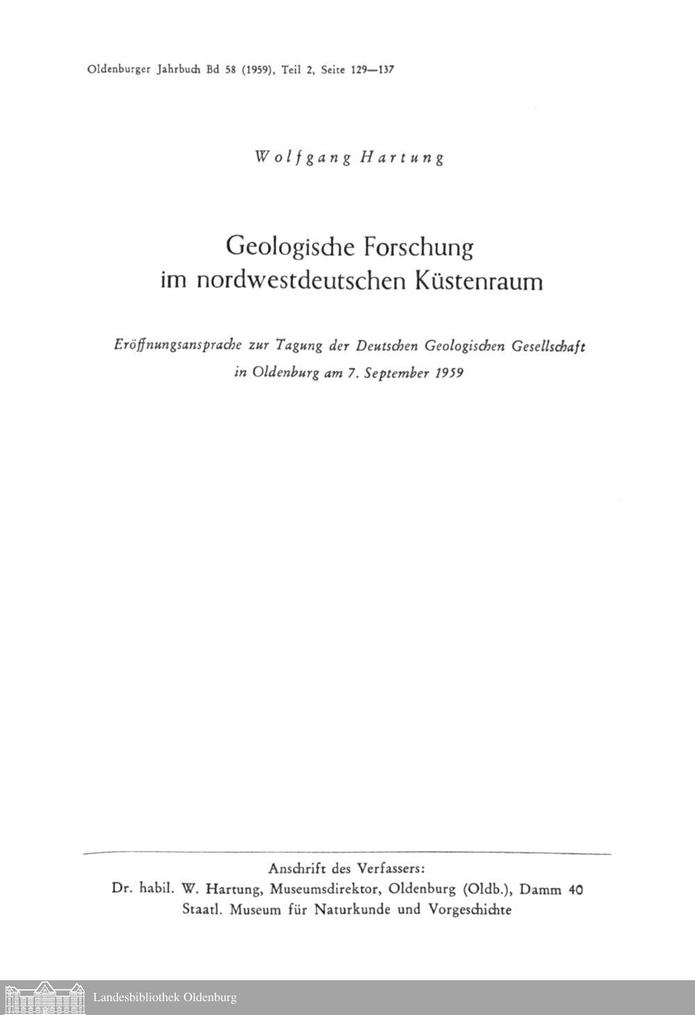 Wolfgang Hartung: Geologische Forschung im nordwestdeutschen Küstenraum. Eröffnungsansprache...