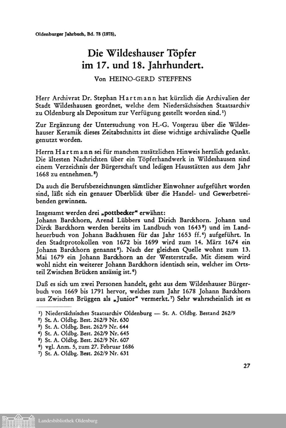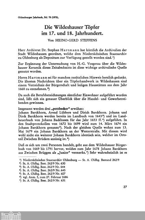 Die Wildeshauser Töpfer im 17. und 18. Jahrhundert. Von Heino-Gerd Steffens