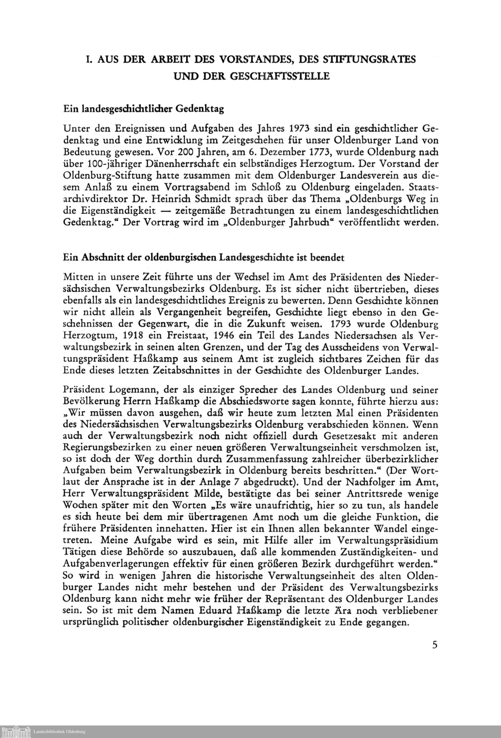 Bericht der Oldenburg-Stiftung e. V. für das Jahr 1973