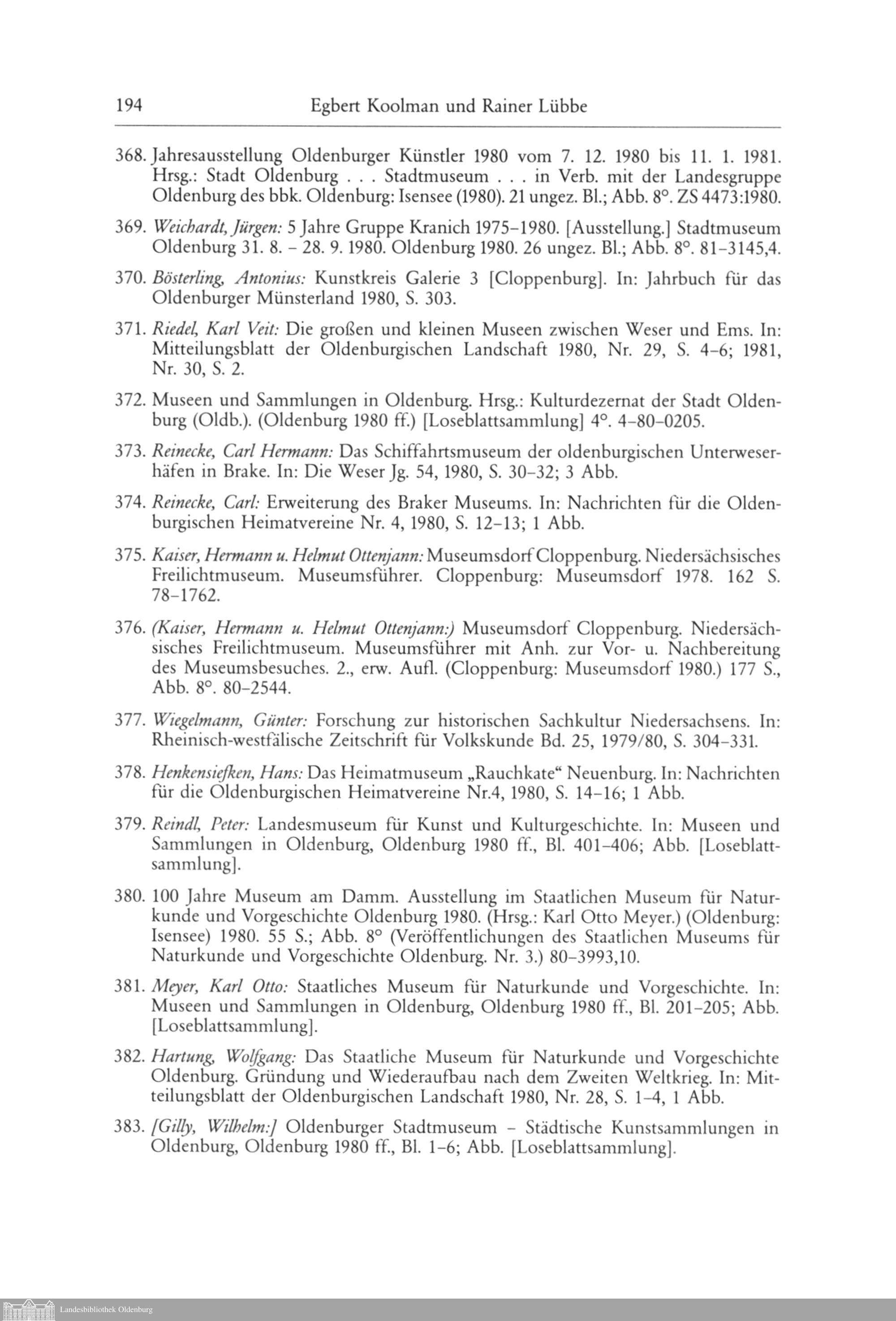 Egbert Koolman und Rainer Lübbe: Oldenburgische Bibliographie 1980. In der Landesbibliothek...