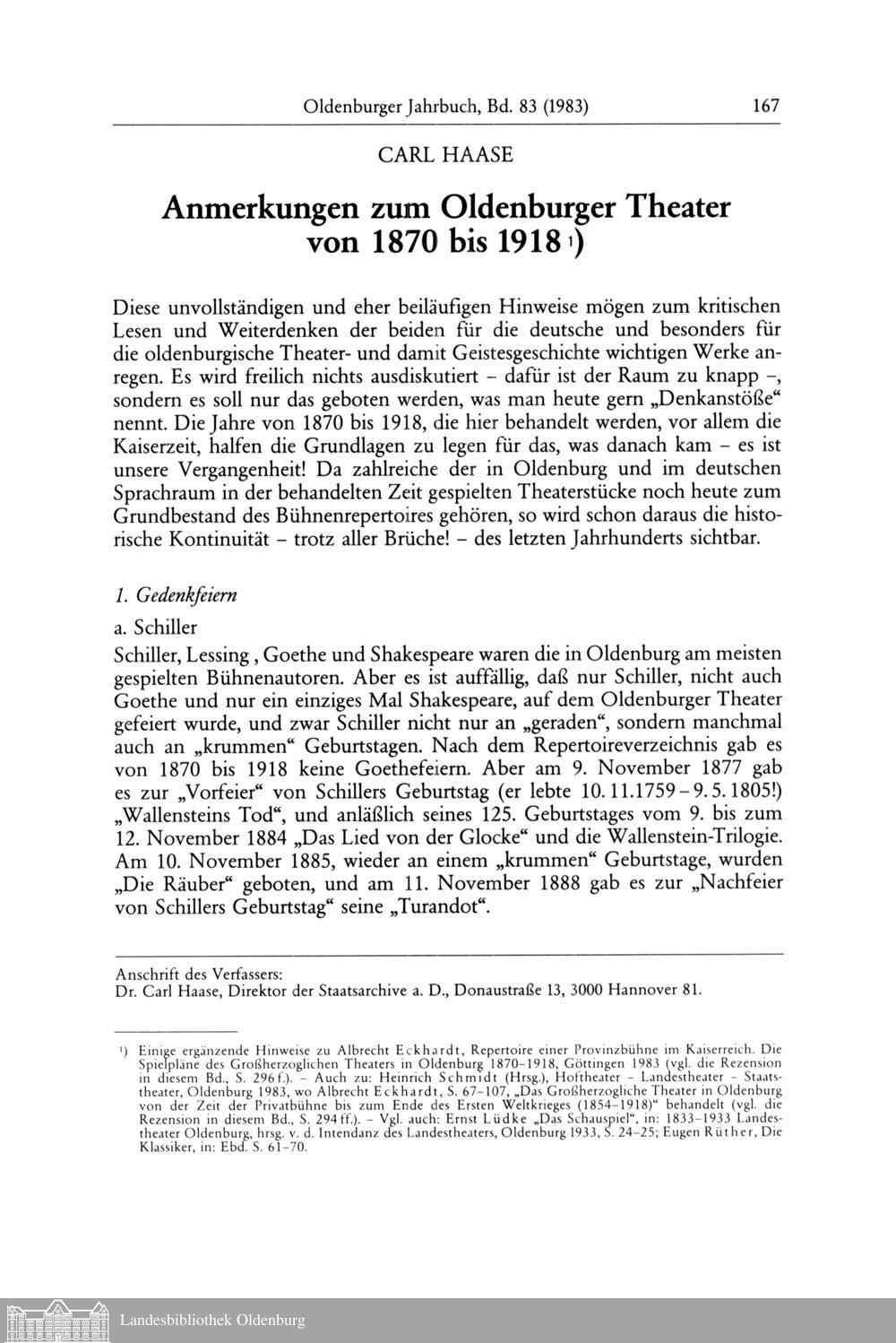 Carl Haase: Anmerkungen zum Oldenburger Theater von 1870 bis 1918