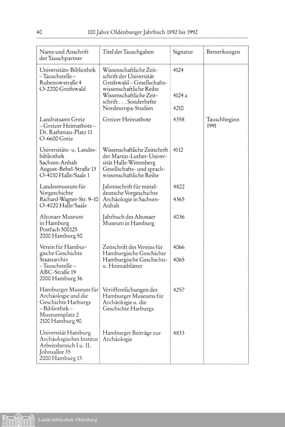 2. Liste der Tauschpartner des Oldenburger Jahrbuchs