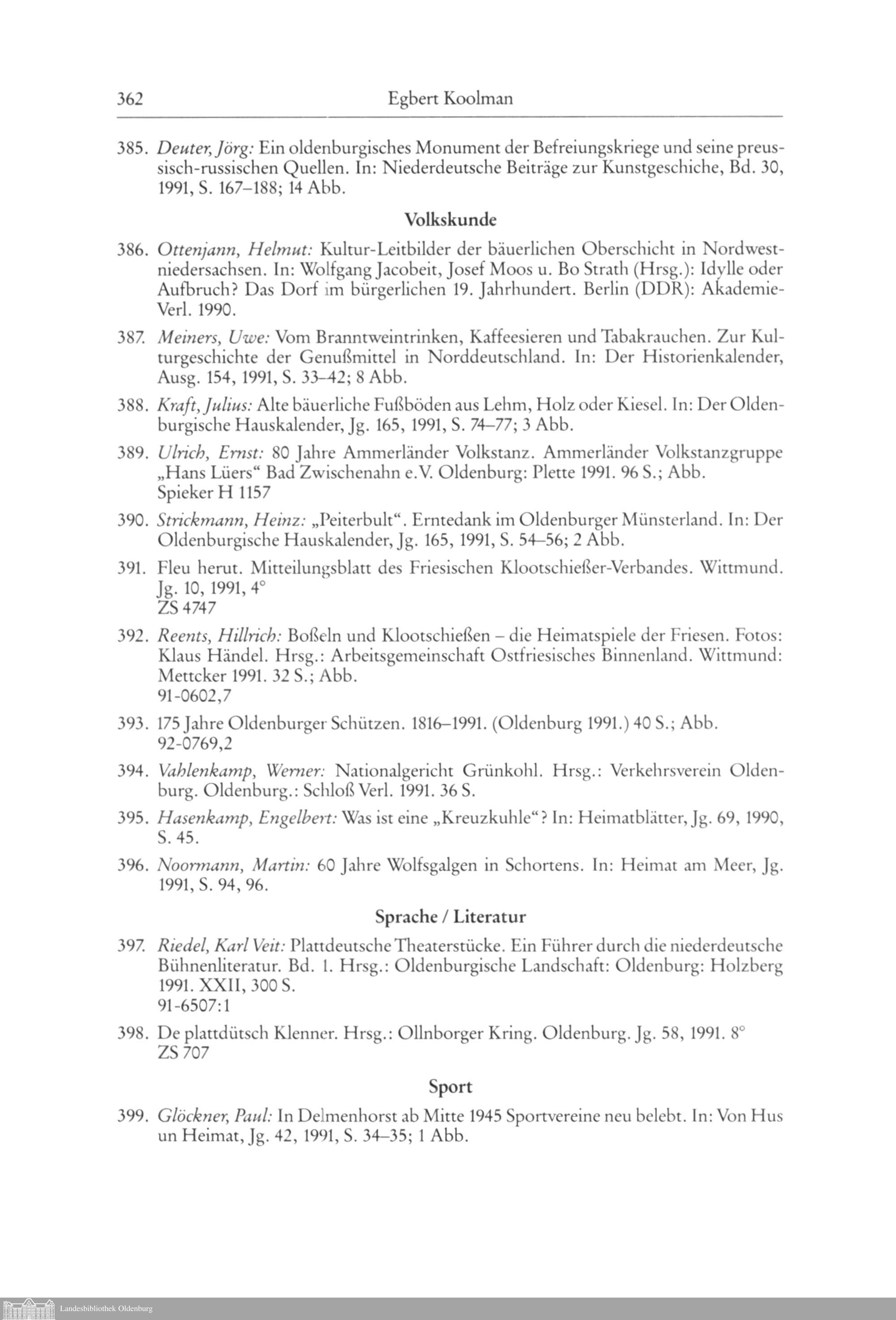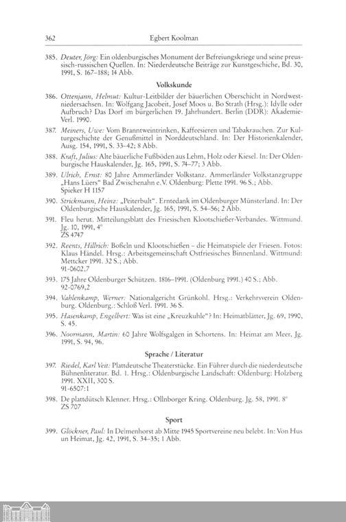 Egbert Koolman: Oldenburgische Bibliographie 1991. (Mit Nachträgen aus den vorhergehenden...
