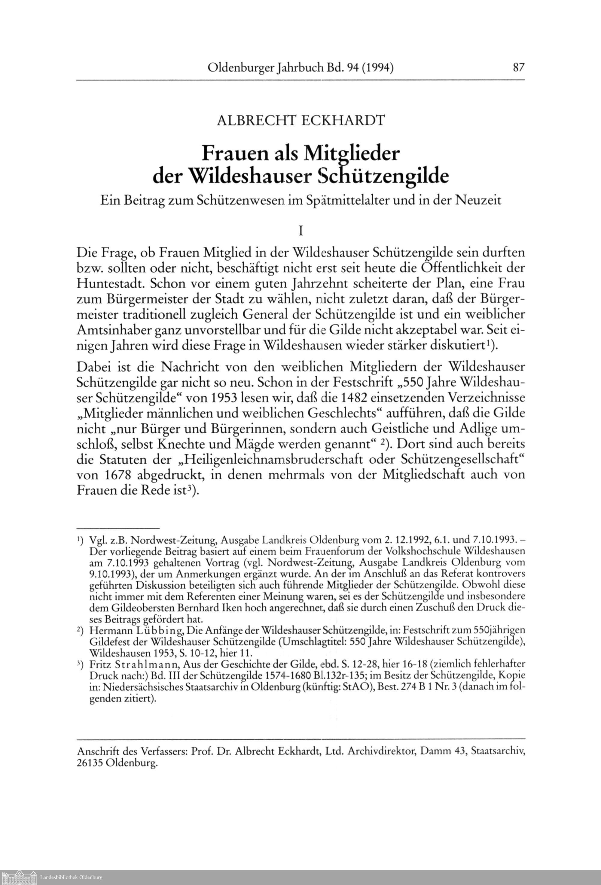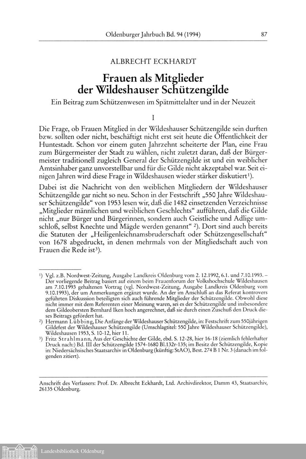 Albrecht Eckhardt: Frauen als Mitglieder der Wildeshauser Schützengilde. Ein Beitrag...