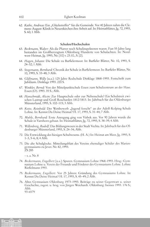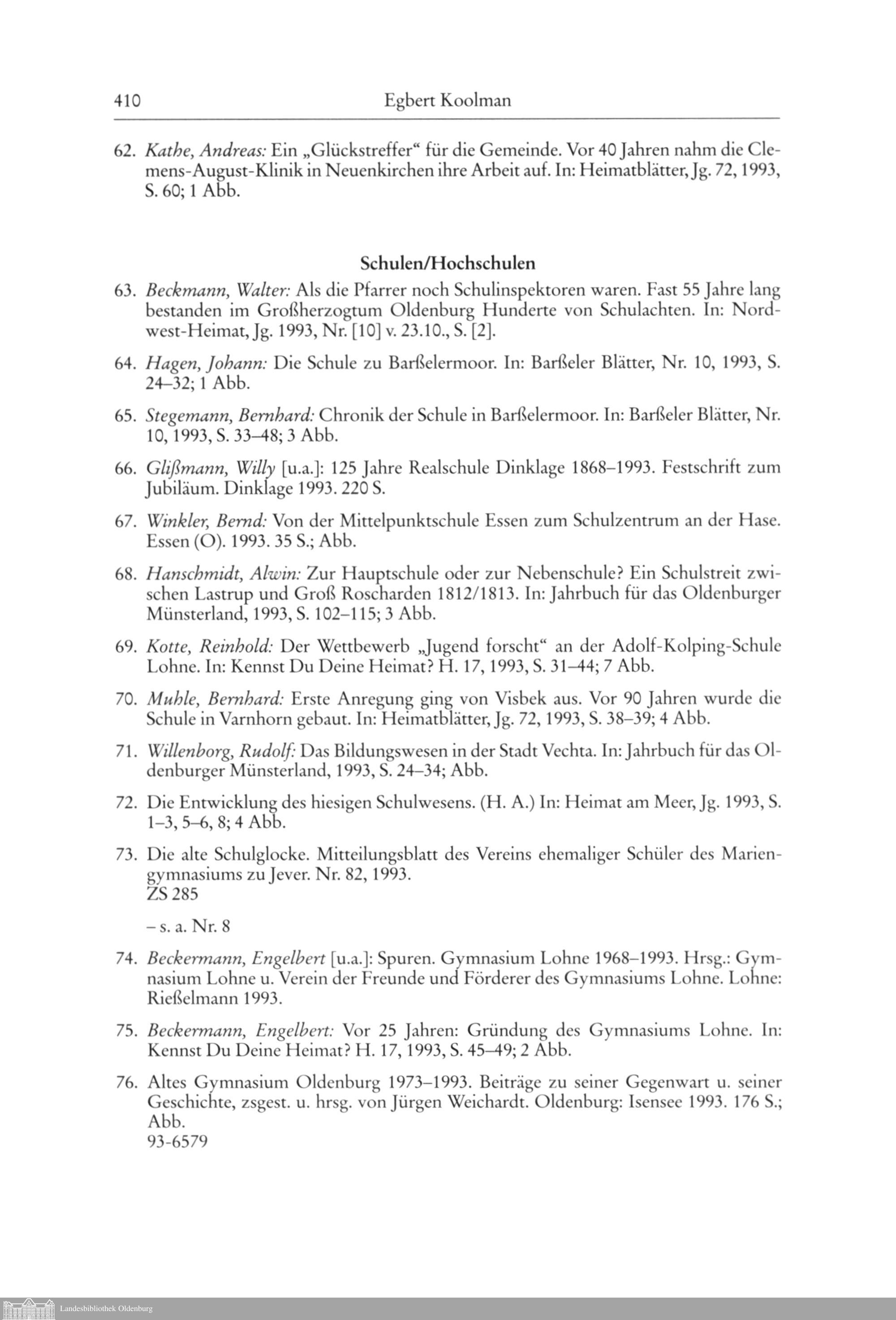 Egbert Koolman und Rainer Lübbe: Oldenburgische Bibliographie 1993 (Mit Nachträgen...