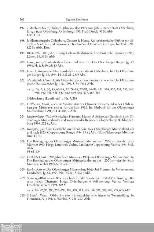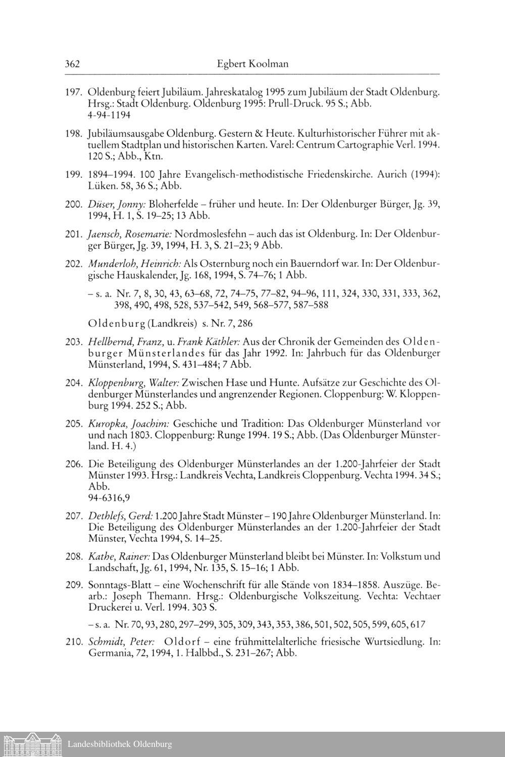 Egbert Koolman: Oldenburgische Bibliographie 1994 (Mit Nachträgen aus den vergangenen...