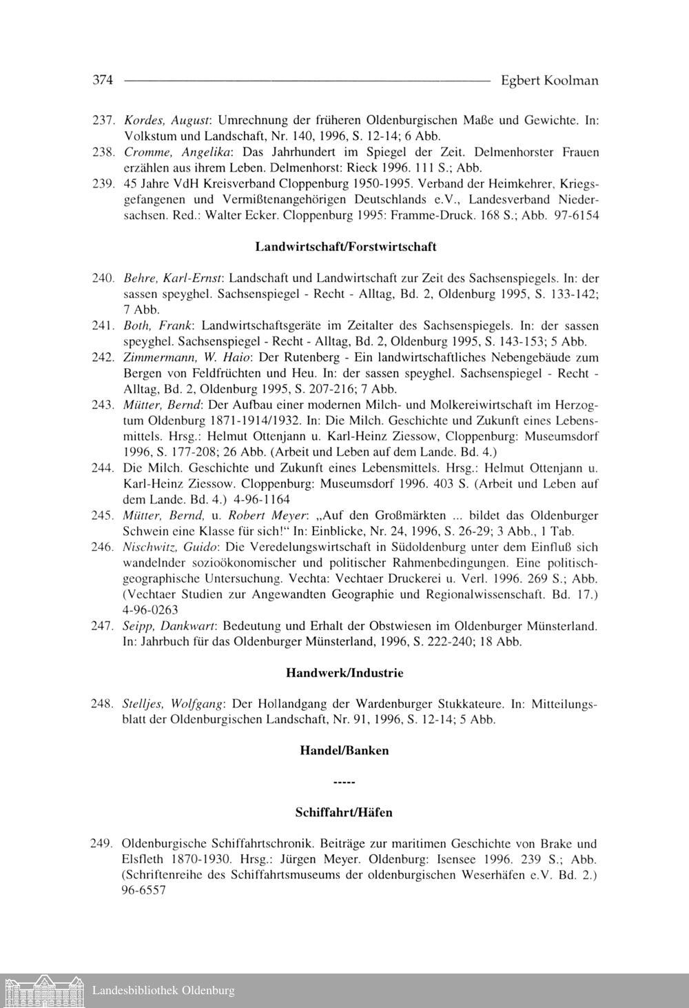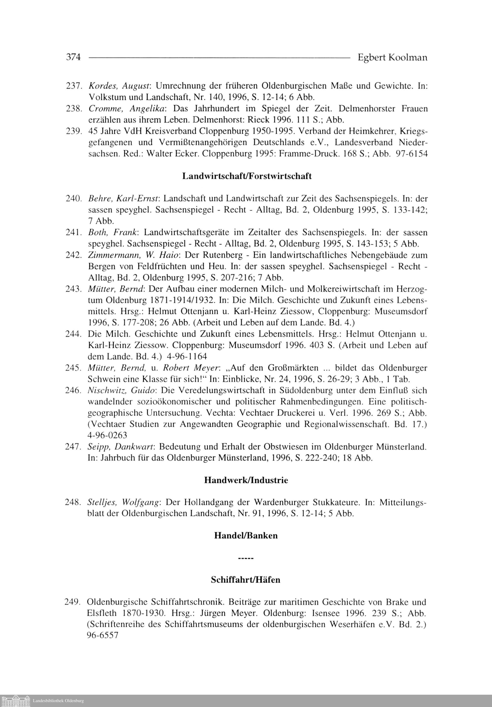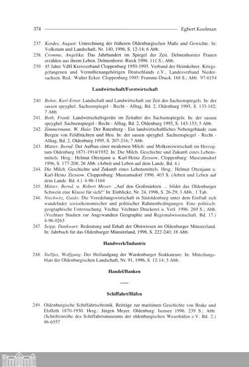 Egbert Koolman: Oldenburgische Bibliographie 1996 (Mit Nachträgen aus den vergangenen...