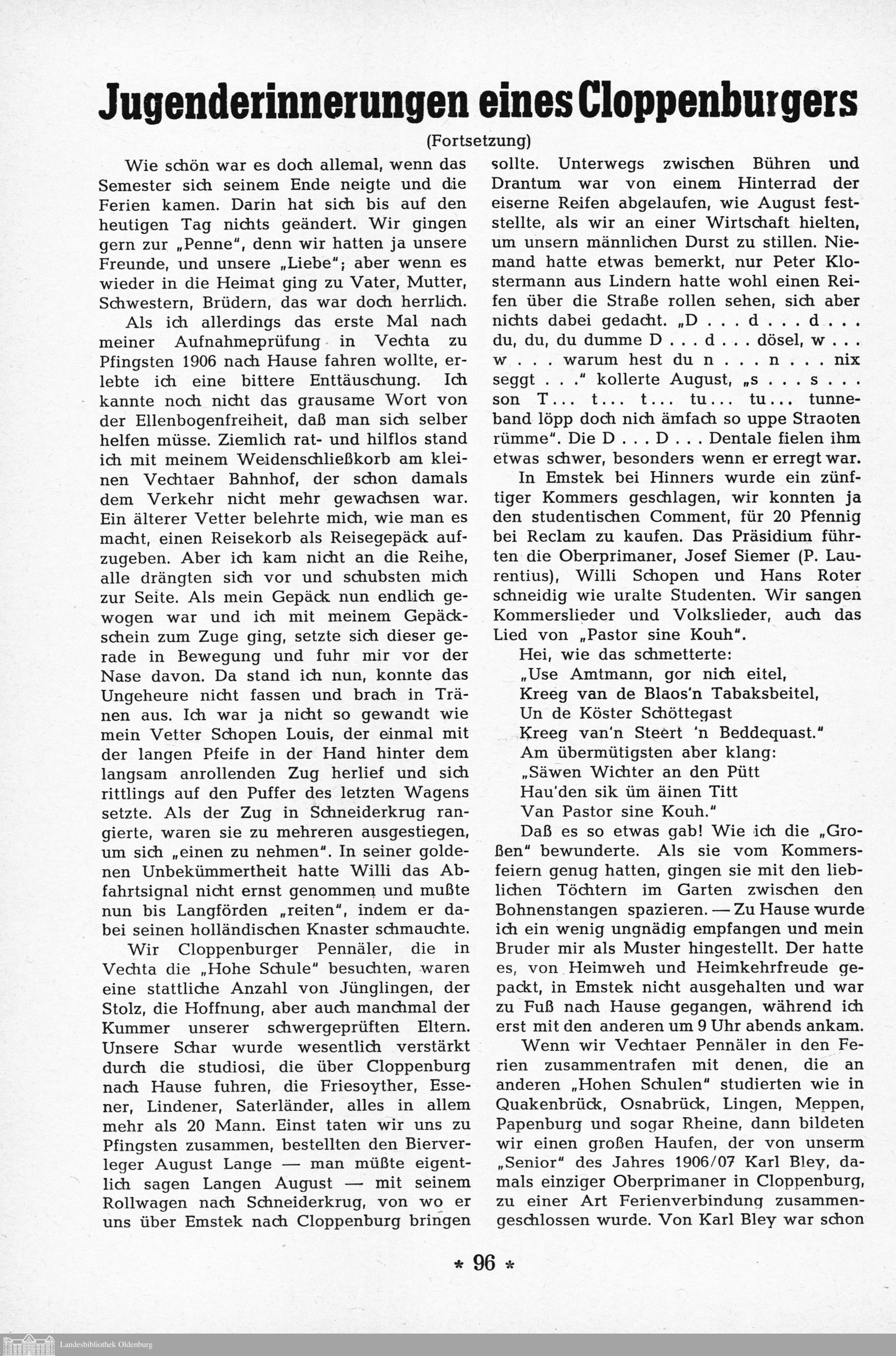 [Hermann Bitter]: Jugenderinnerungen eines Cloppenburgers. (Fortsetzung)