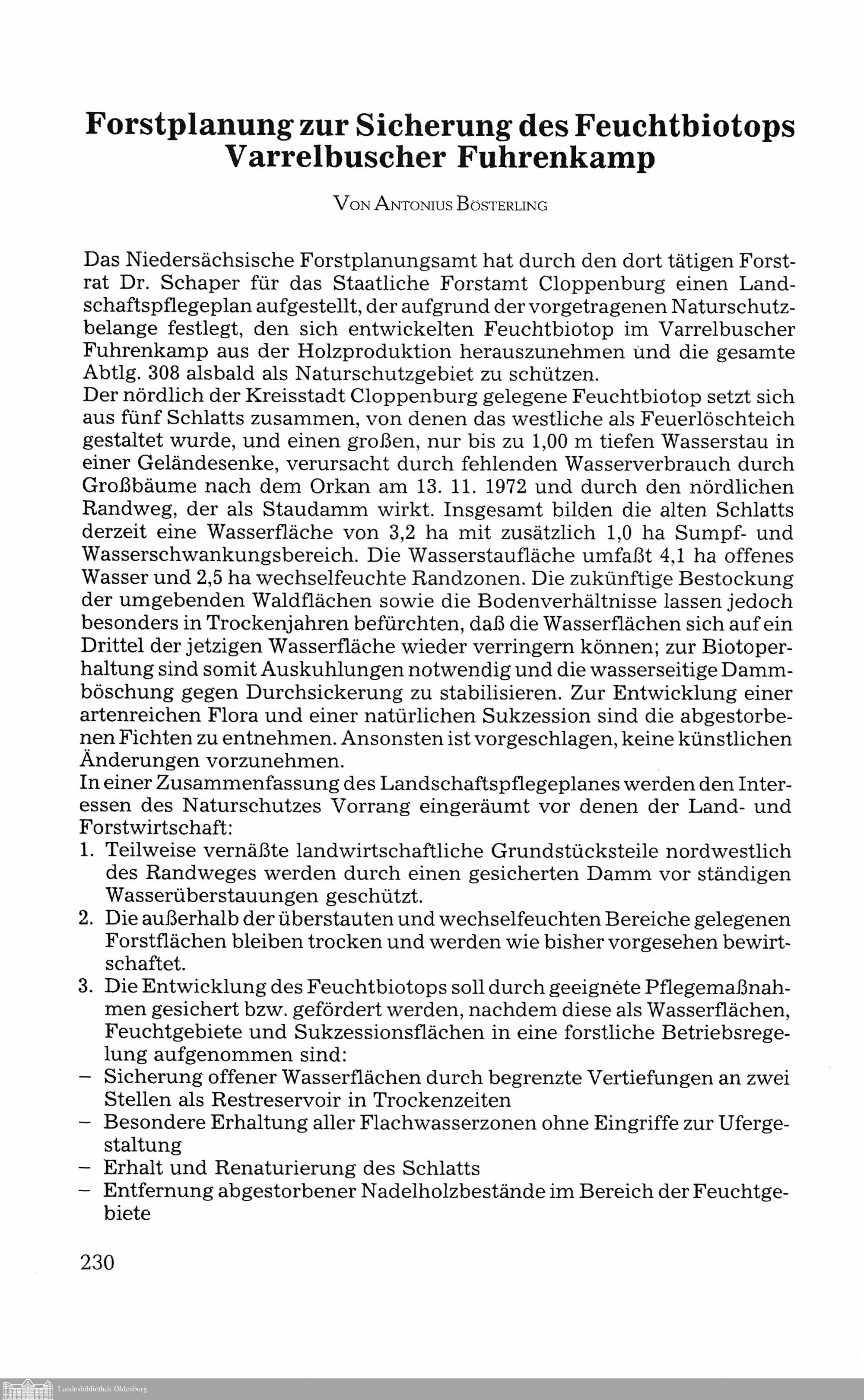 Antonius Bösterling: Forstplanung zur Sicherung des Feutbiotops Varrelbuscher Fu...