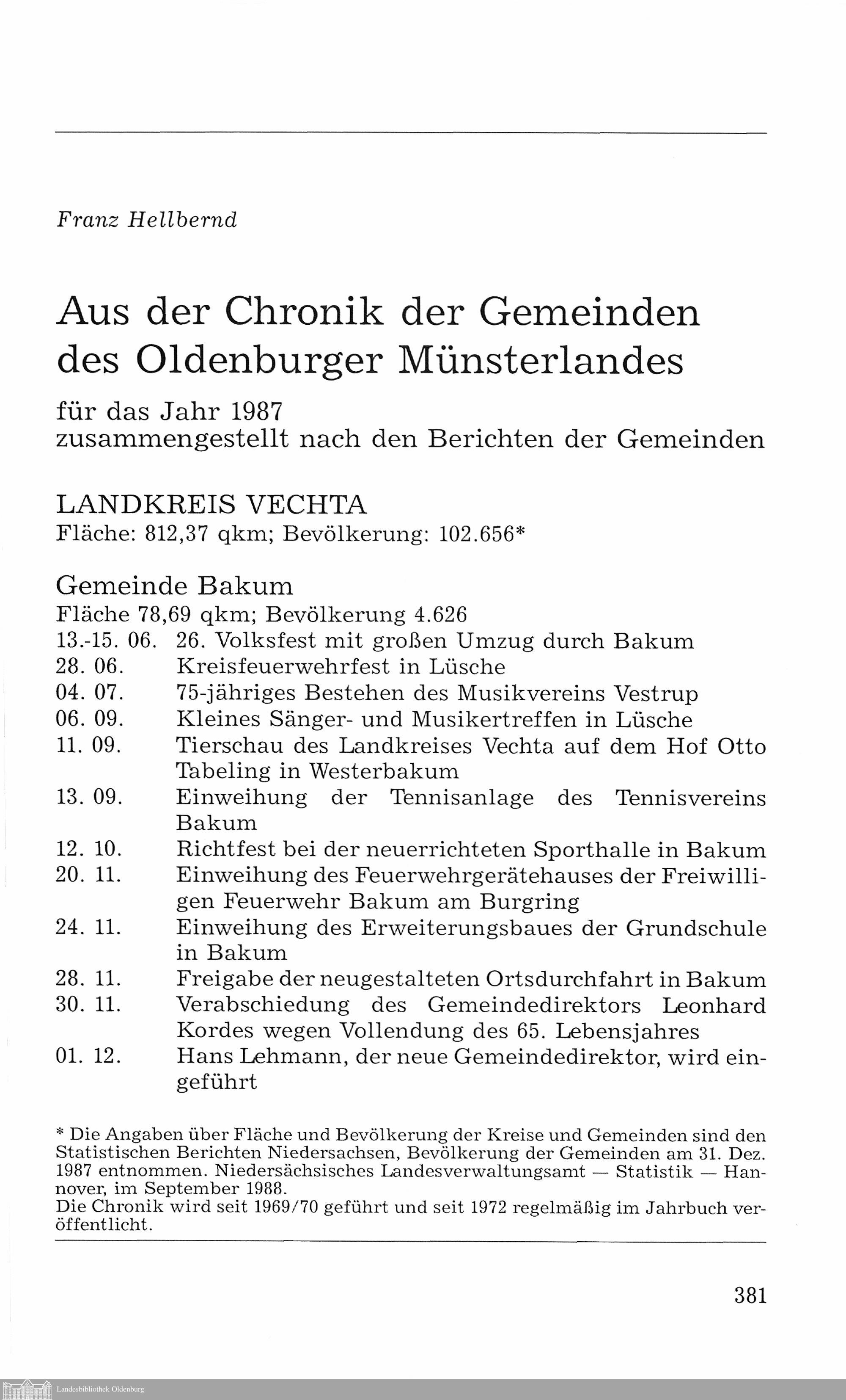 Franz Hellbernd: Aus der Chronik der Gemeinden des Oldenburger Münsterlandes für...