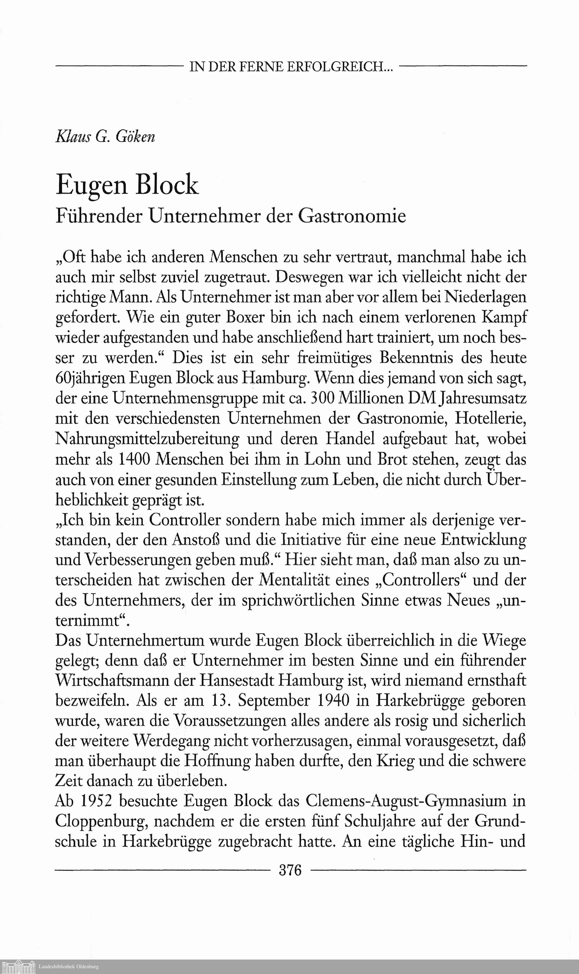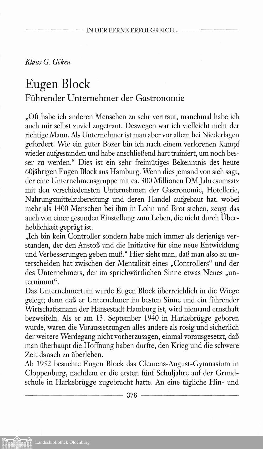 Klaus G. Göken: Eugen Block. Führender Unternehmer der Gastronomie [mit Abb.]