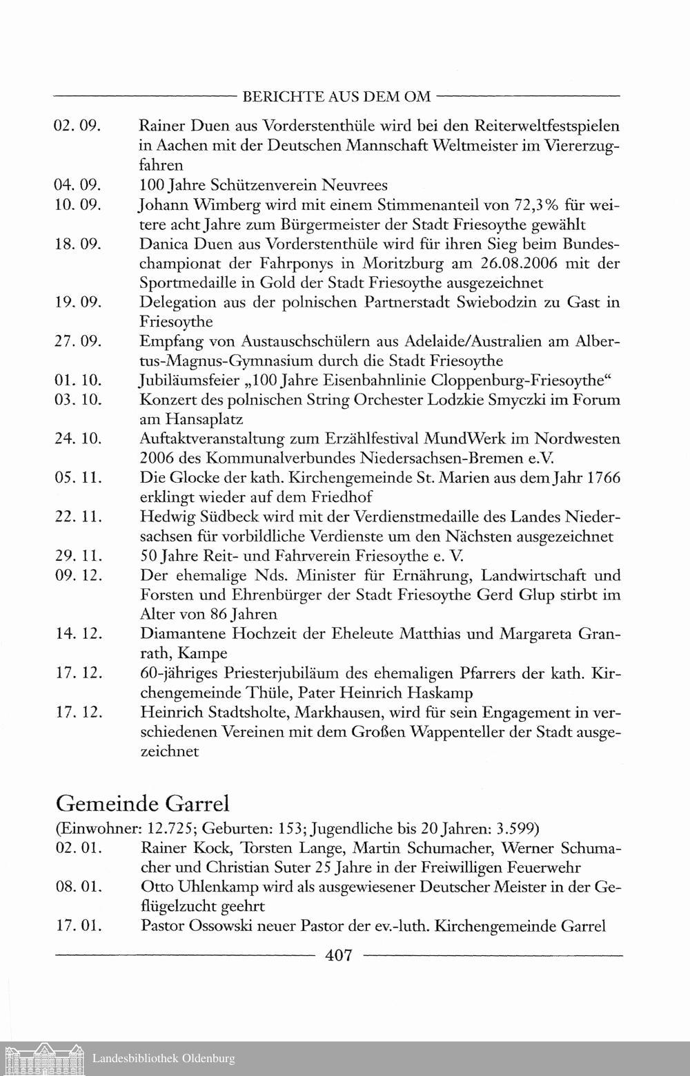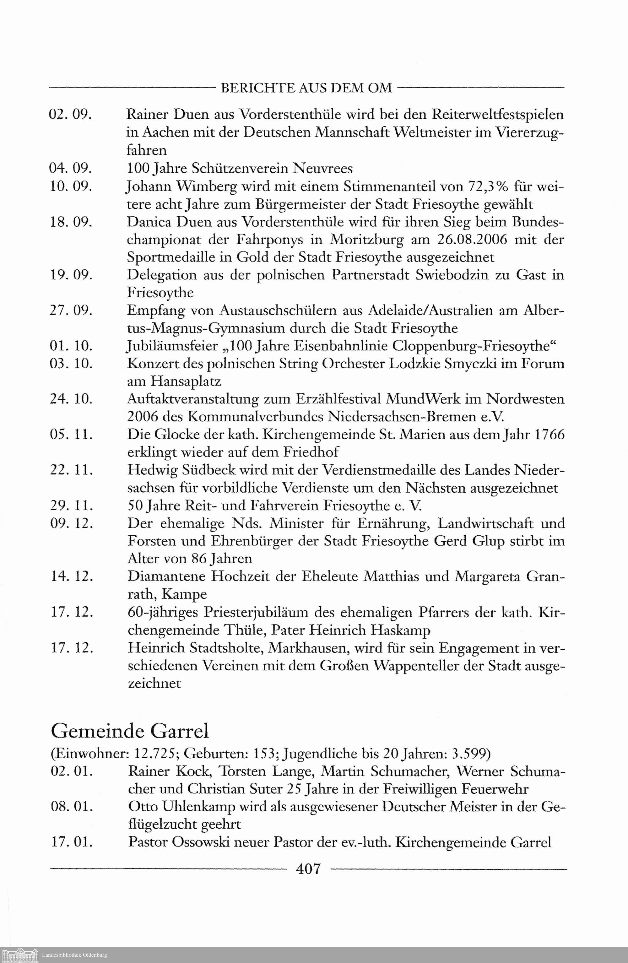Aus der Chronik der Gemeinden des Oldenburger Münsterlandes für das Jahr 2006