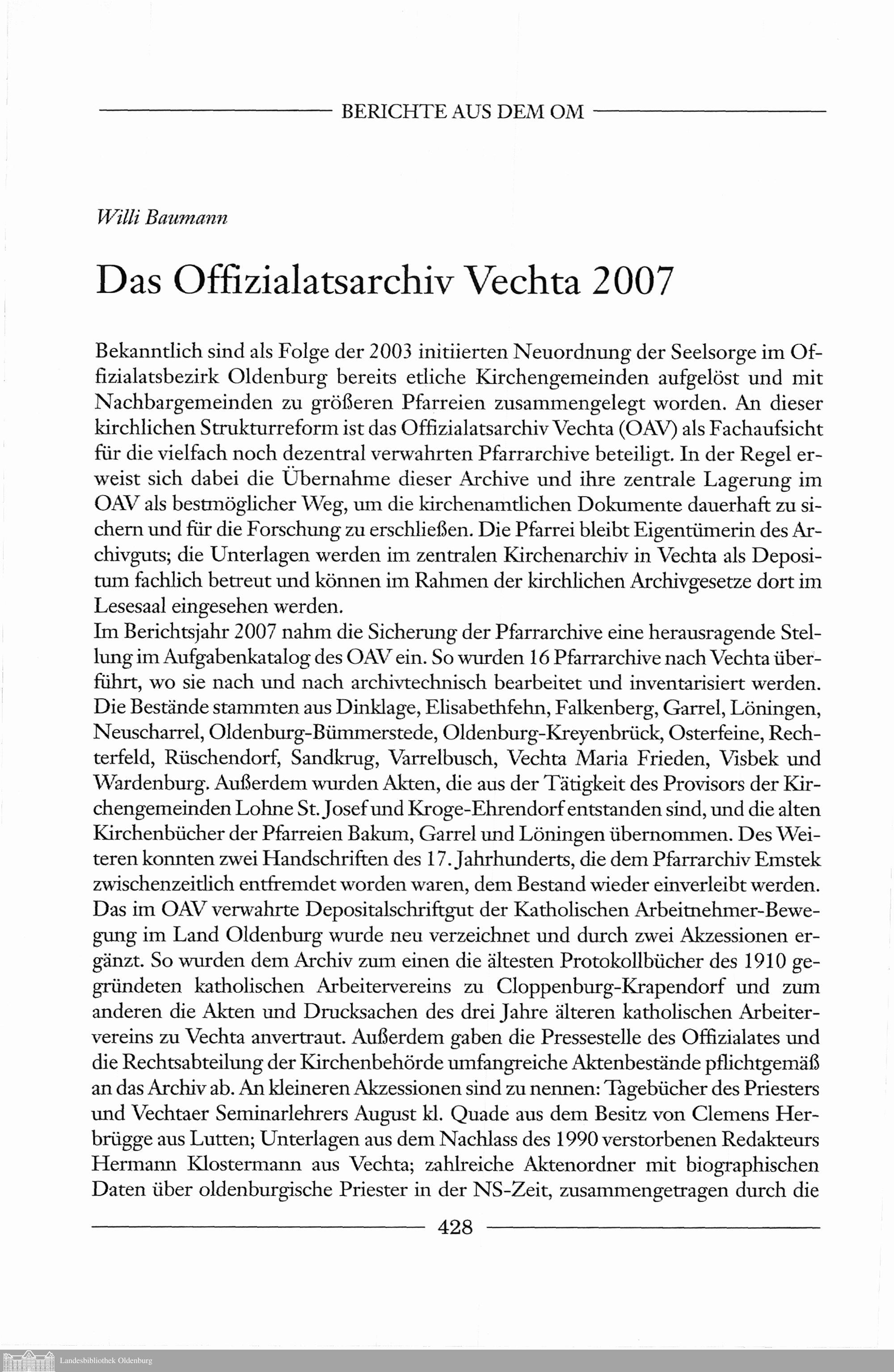 Willi Baumann: Das Offizialatsarchiv Vechta 2007