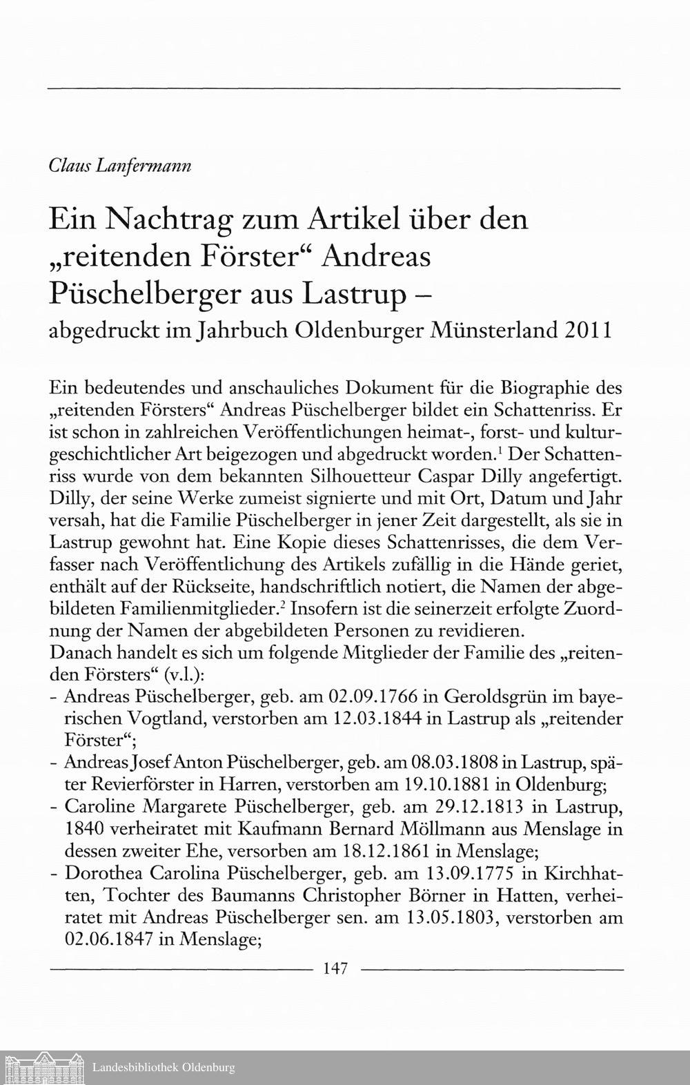 Claus Lanfermann: Ein Nachtrag zum Artikel über den "reitenden Förster" Andreas Püschelberger...