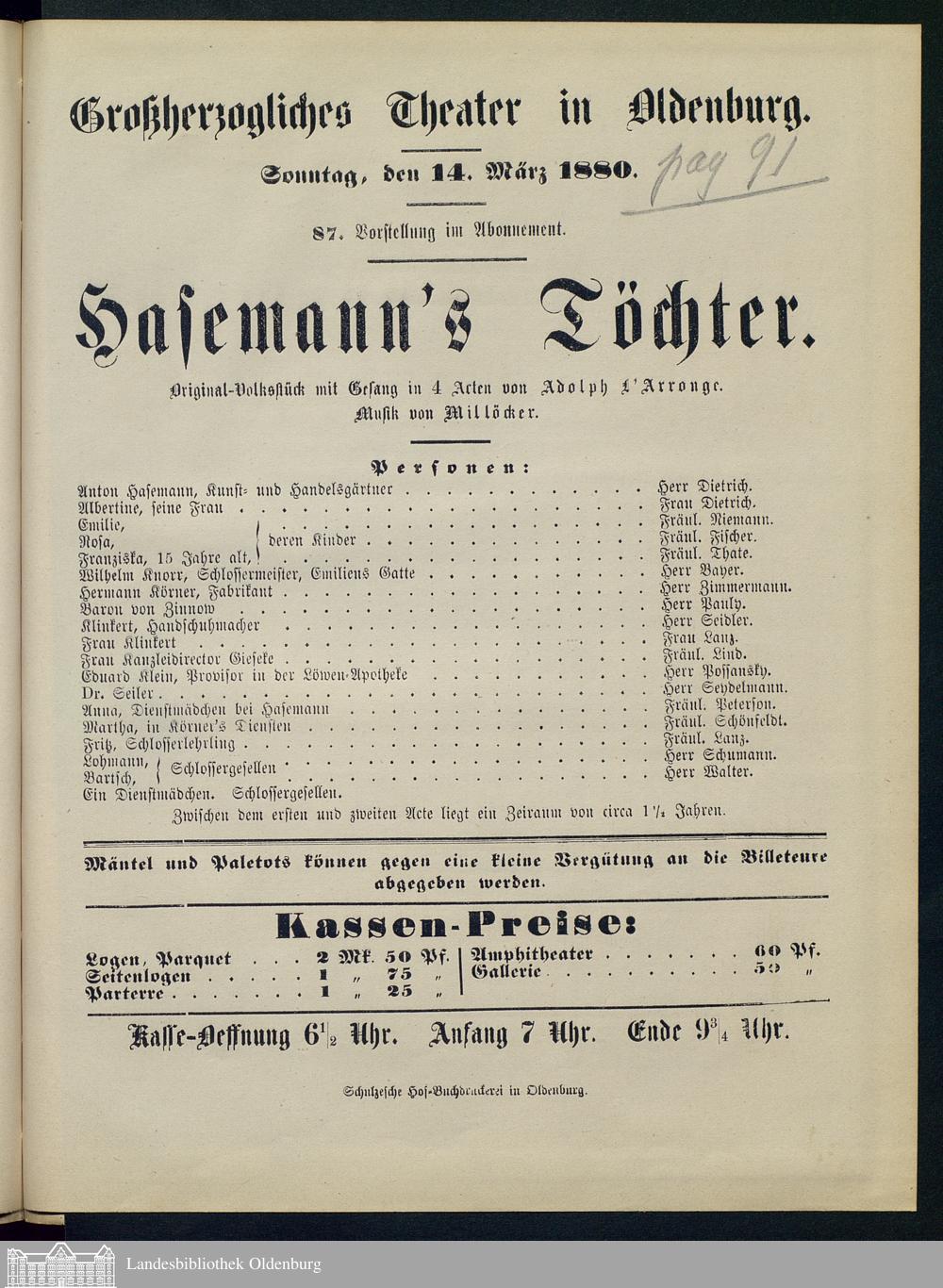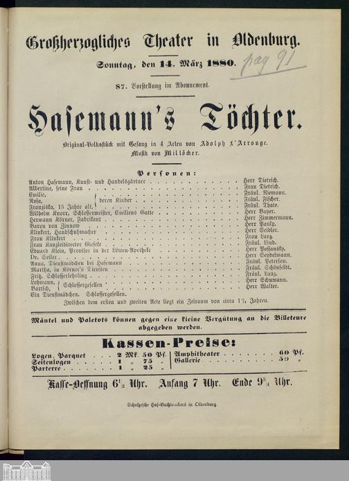 14.03.1880 - Adolph L'Arronge: Hasemann's Töchter.