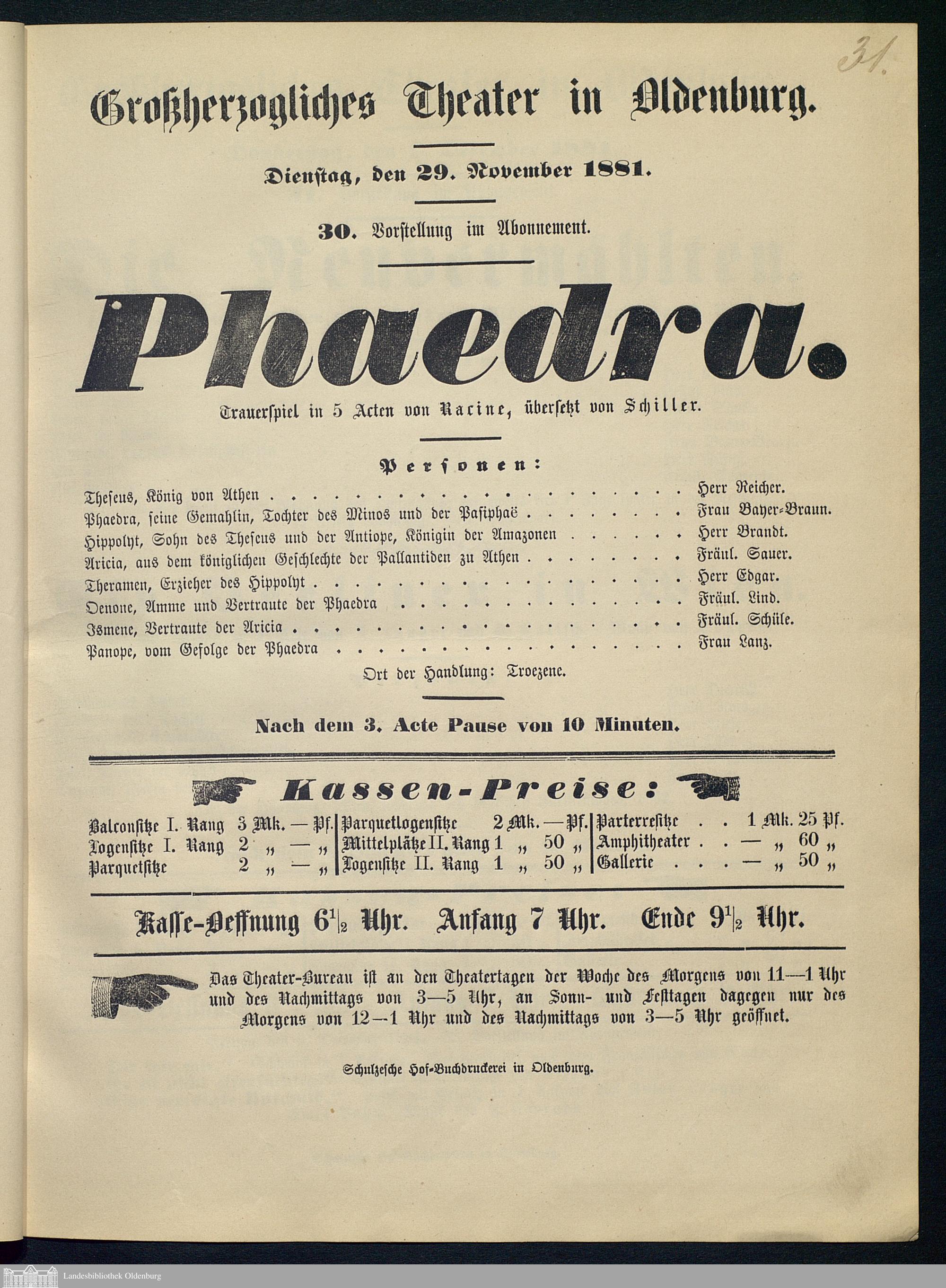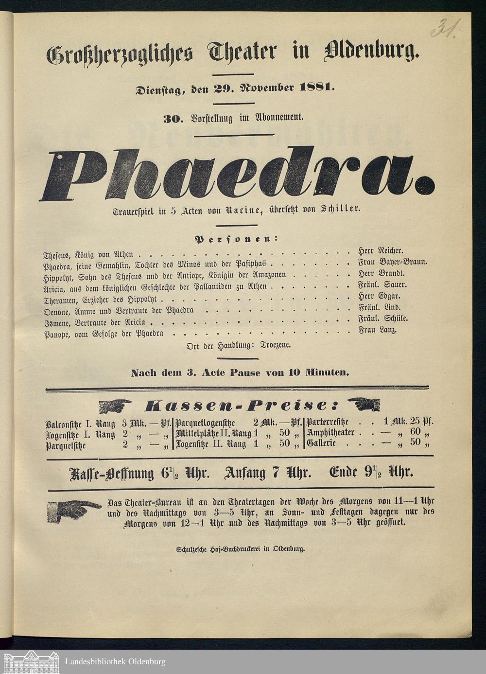 29.11.1881 - Jean Racine / Friedrich von Schiller (Bearb.): Phaedra.
