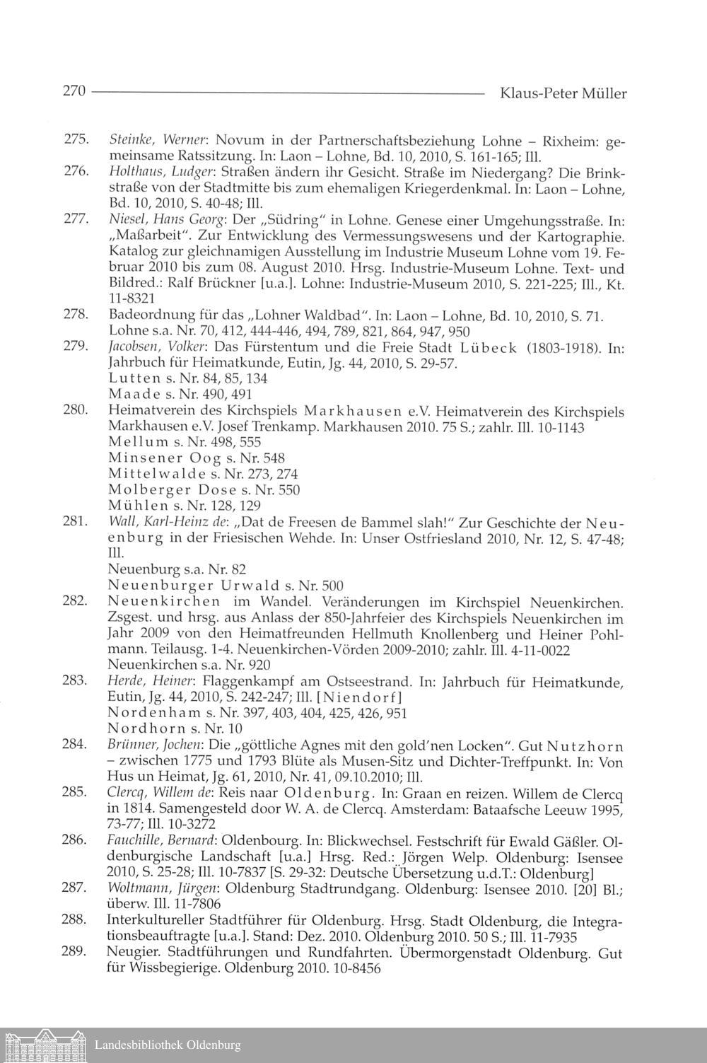 Klaus-Peter Müller: Oldenburgische Bibliographie 2010. Mit Nachträgen aus den vorhergehenden...