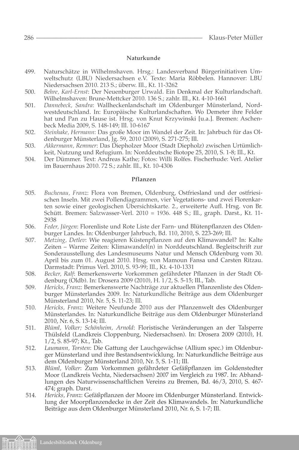 Klaus-Peter Müller: Oldenburgische Bibliographie 2010. Mit Nachträgen aus den vorhergehenden...