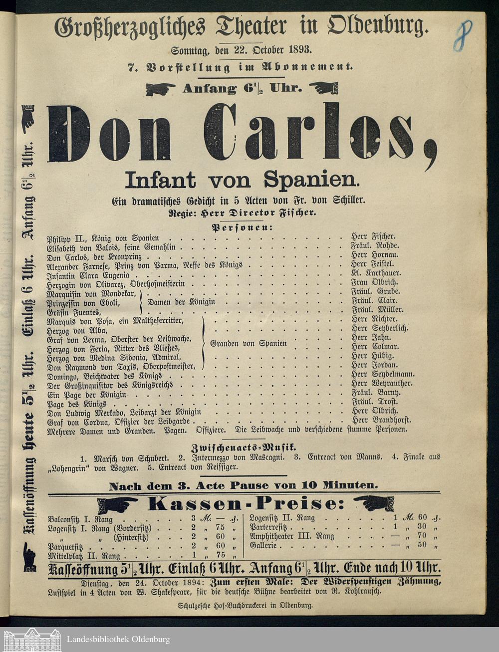 22.10.1893 - Friedrich von Schiller: Don Carlos, Infant von Spanien.