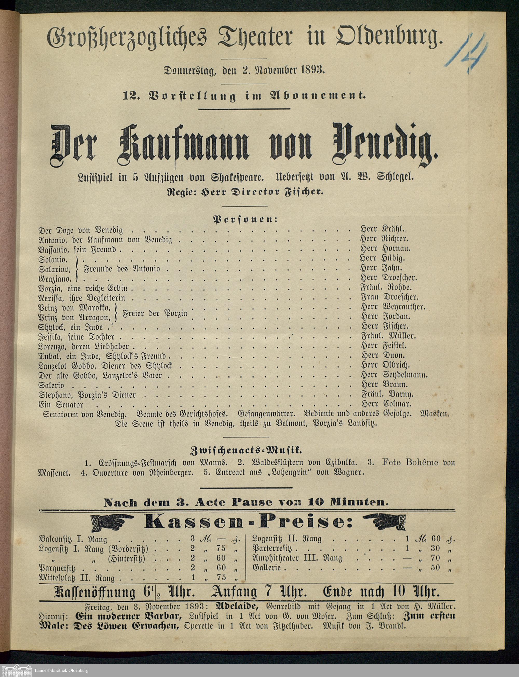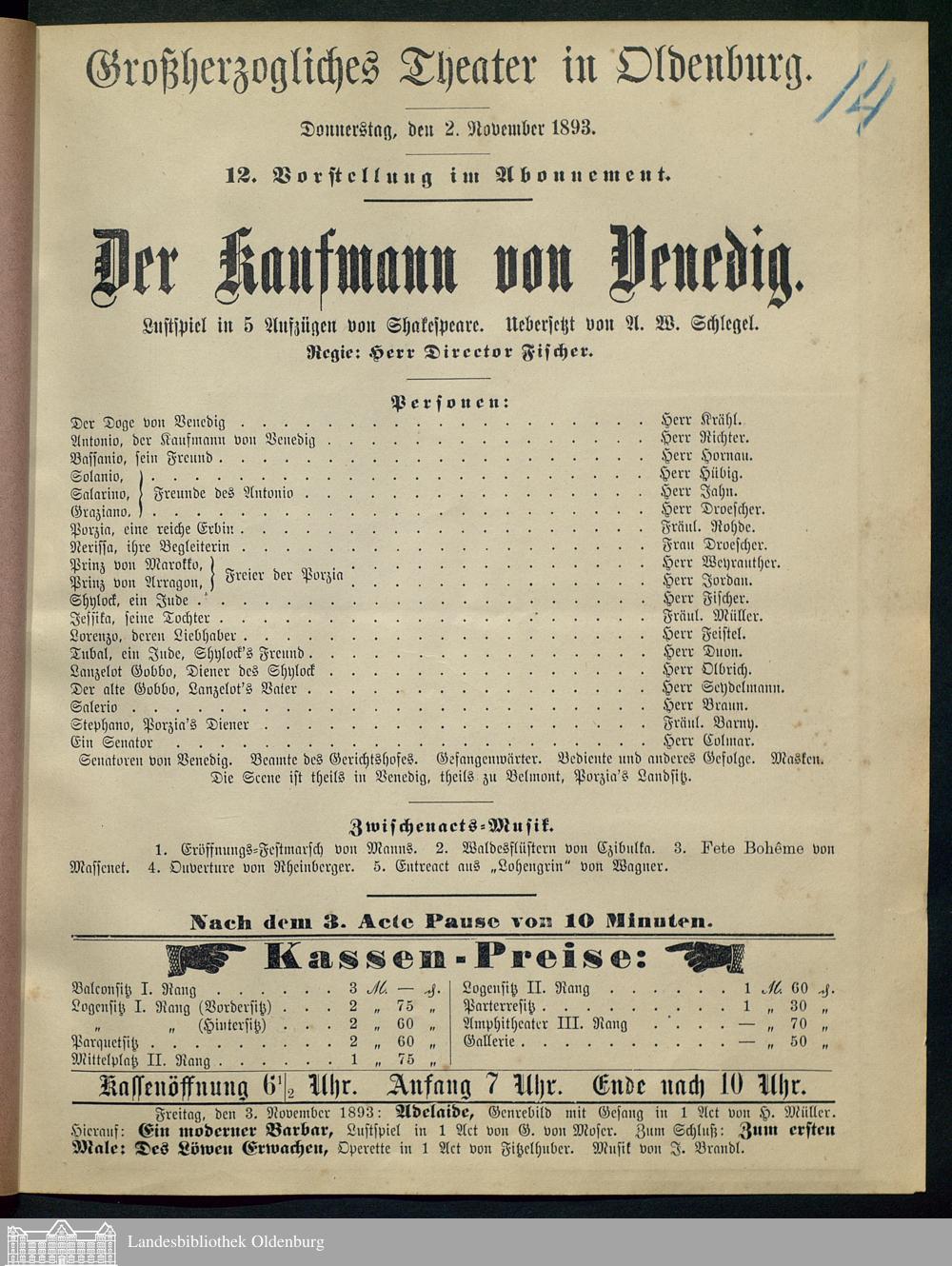 02.11.1893 - William Shakespeare / August Wilhelm Schlegel (Bearb.): Der Kaufmann...