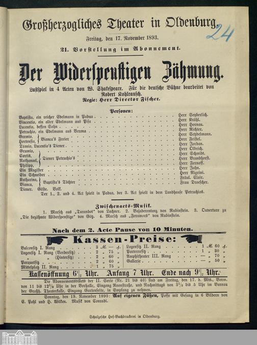 17.11.1893 - William Shakespeare / Robert Kohlrausch (Bearb.): Der Widerspenstigen...