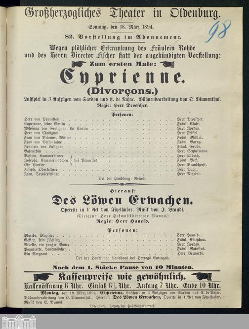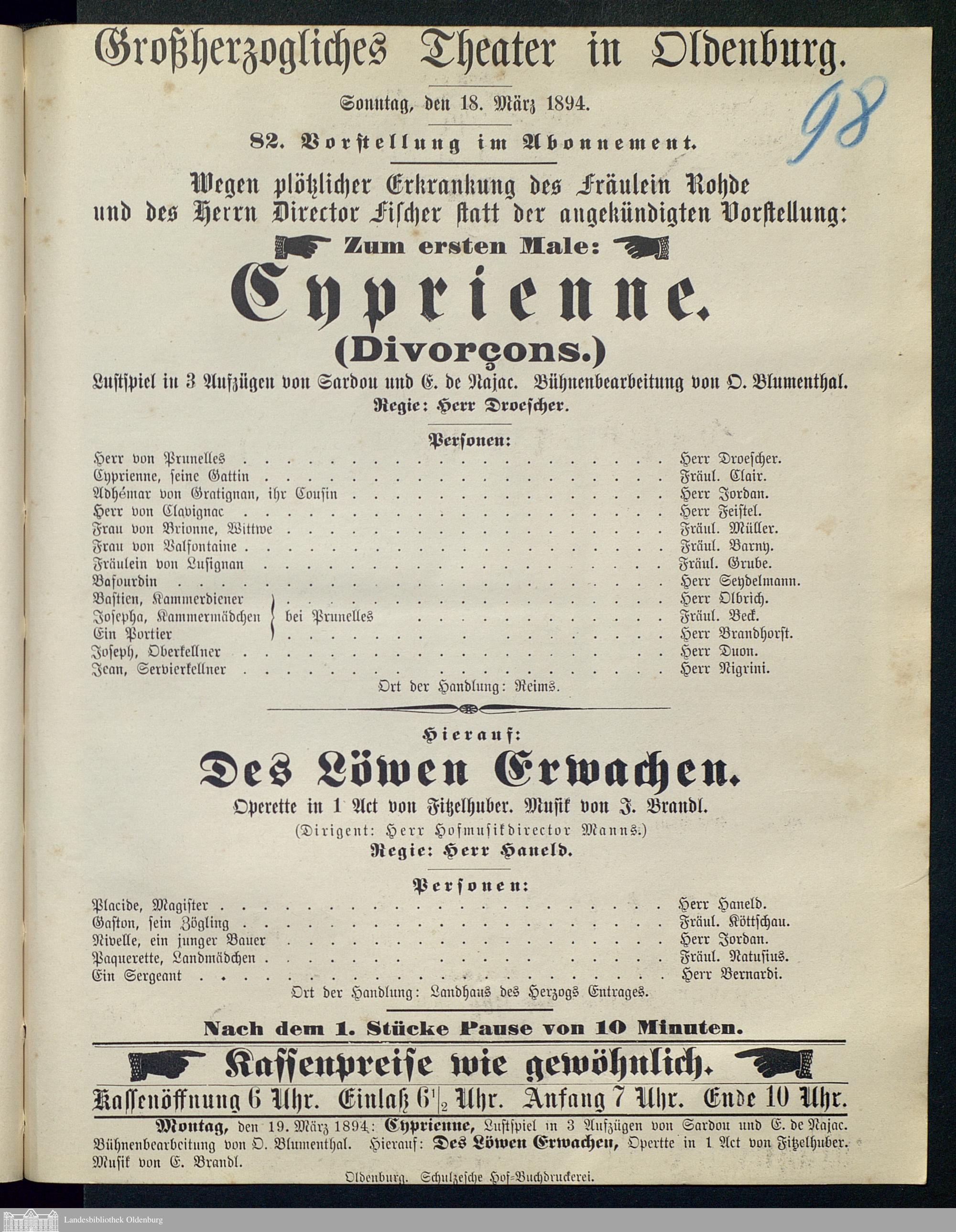 18.03.1894 - Victorien Sardou und Emile de Najac / Oskar Blumenthal (Bearb.): Cy...