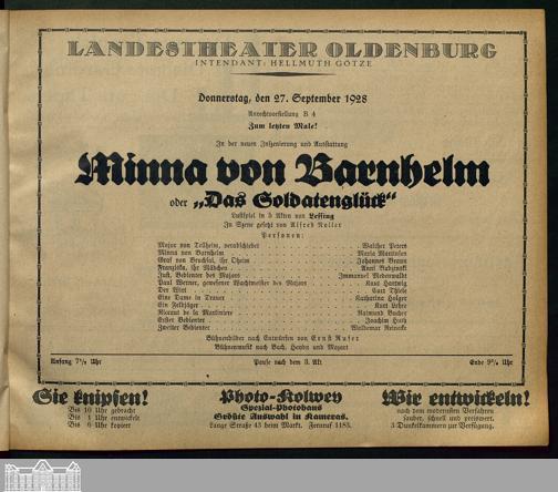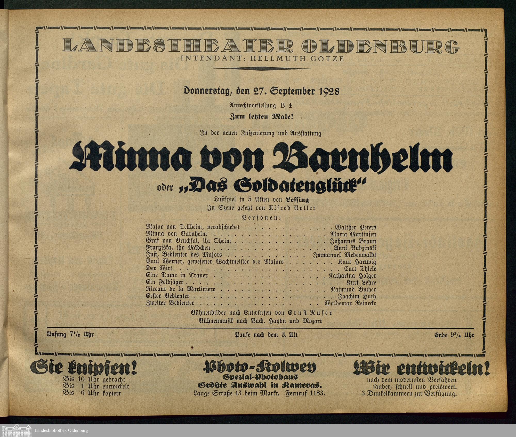27.09.1928 - Gotthold Ephraim Lessing: Minna von Barnhelm oder "Das Soldatenglüc...