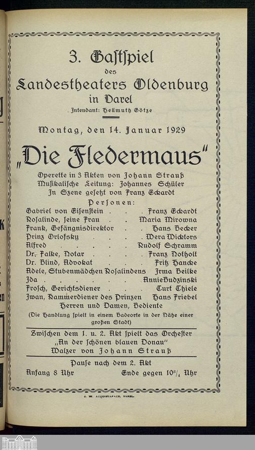 14.01.1929 - Johann Strauß: Die Fledermaus. [Gastspiel in Varel]