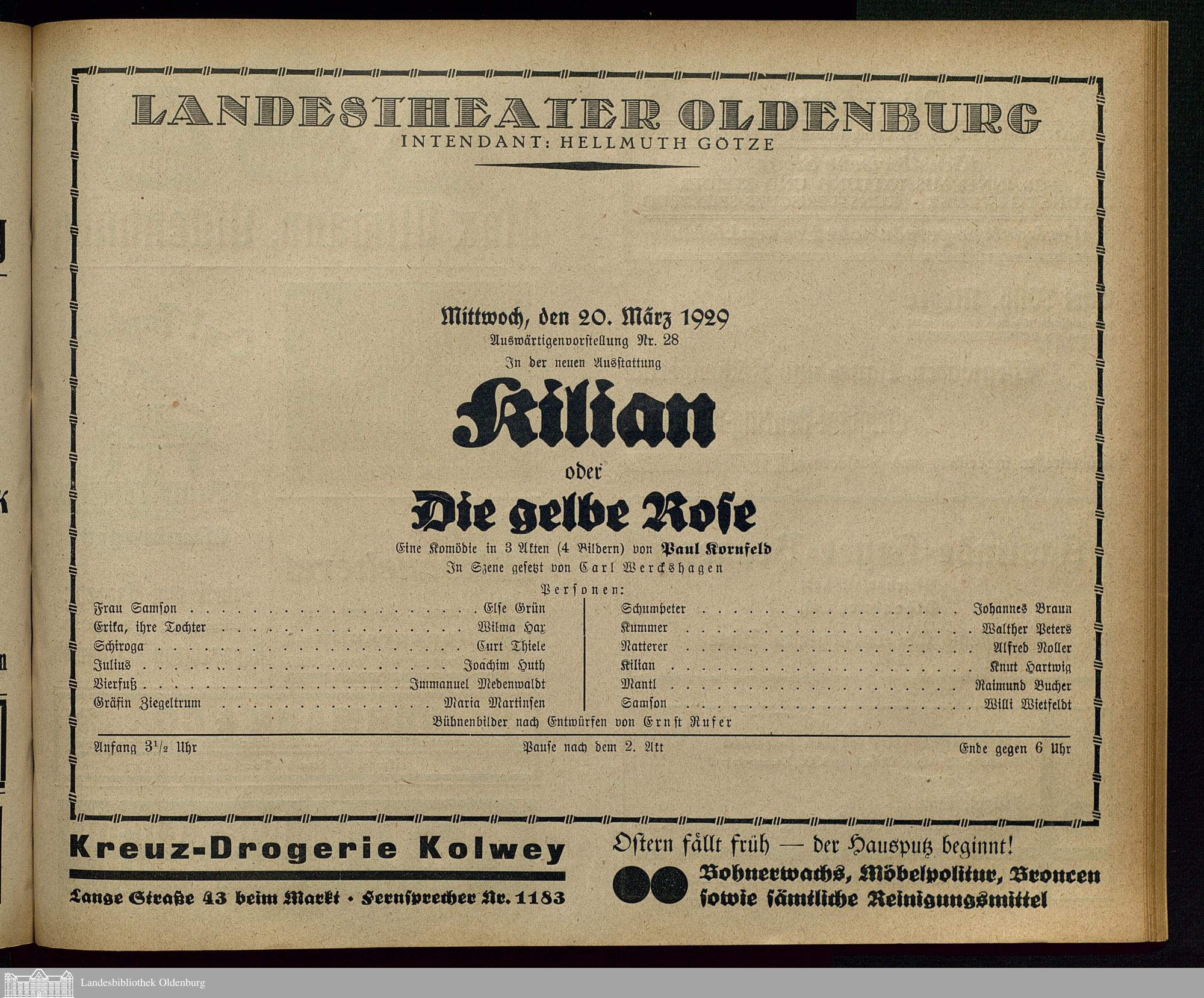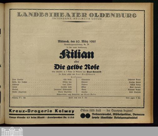 20.03.1929 - Paul Kornfeld: Kilian oder: Die gelbe Rose.