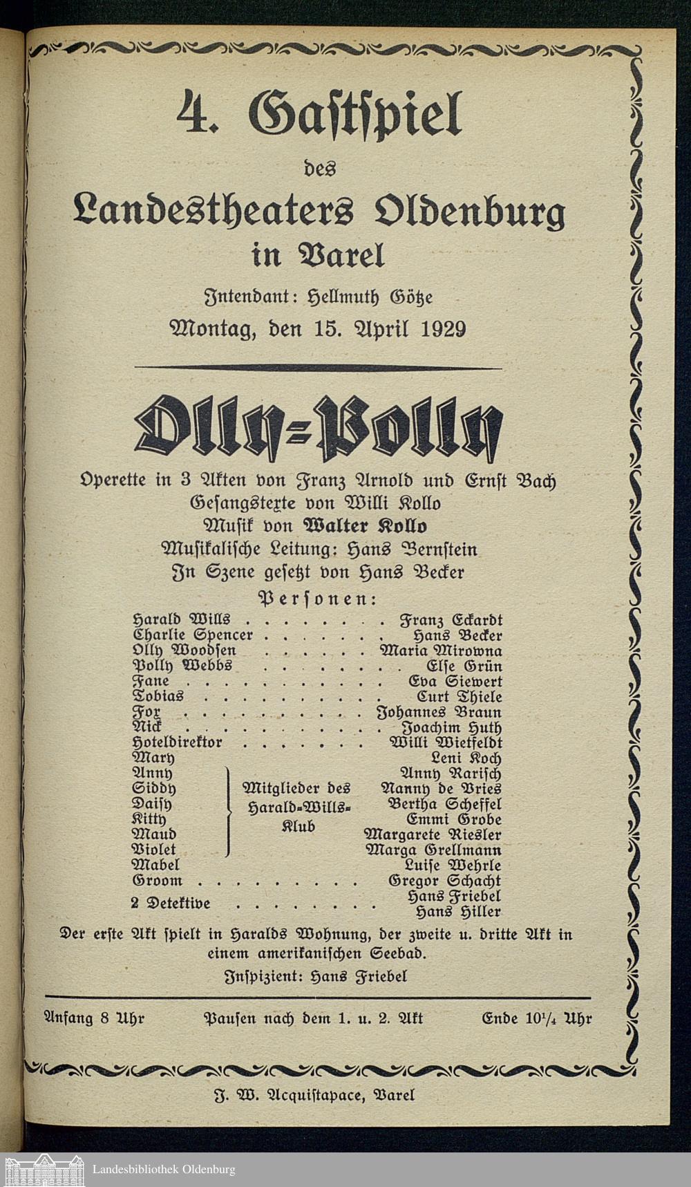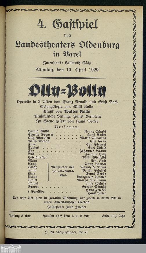 15.04.1929 - Franz Arnold und Ernst Bach: Olly-Polly. [Gastspiel in Varel]