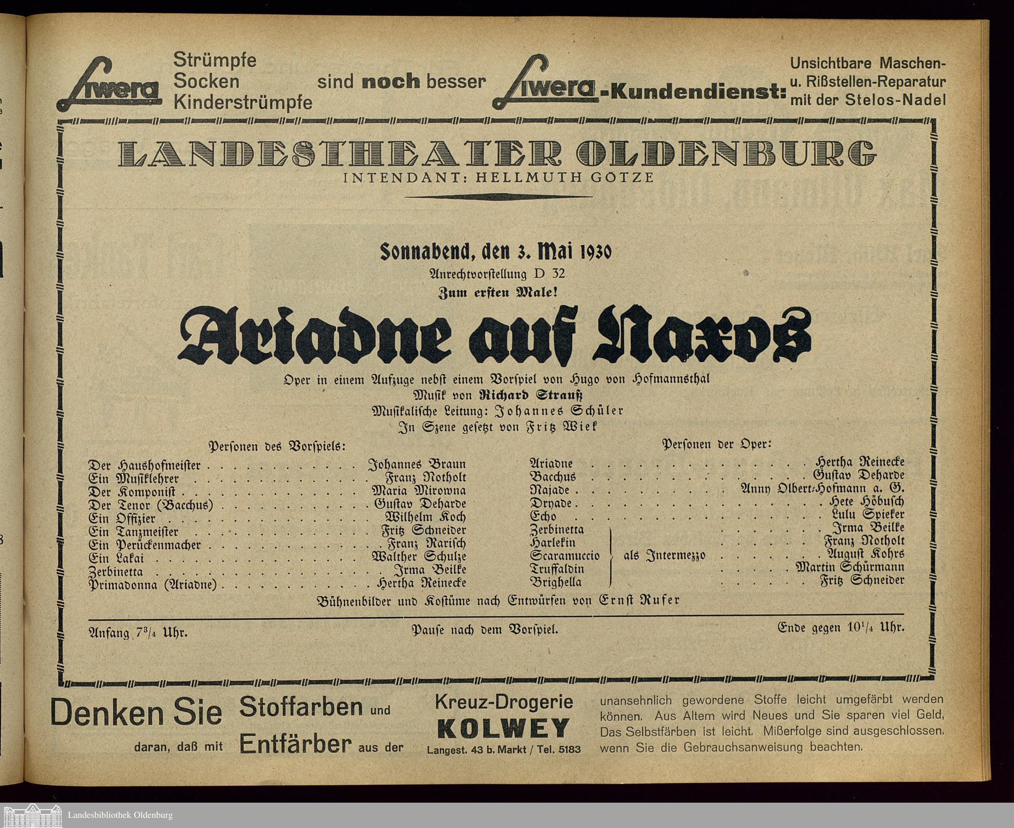 03.05.1930 - Hugo von Hofmannsthal: Ariadne auf Naxos.