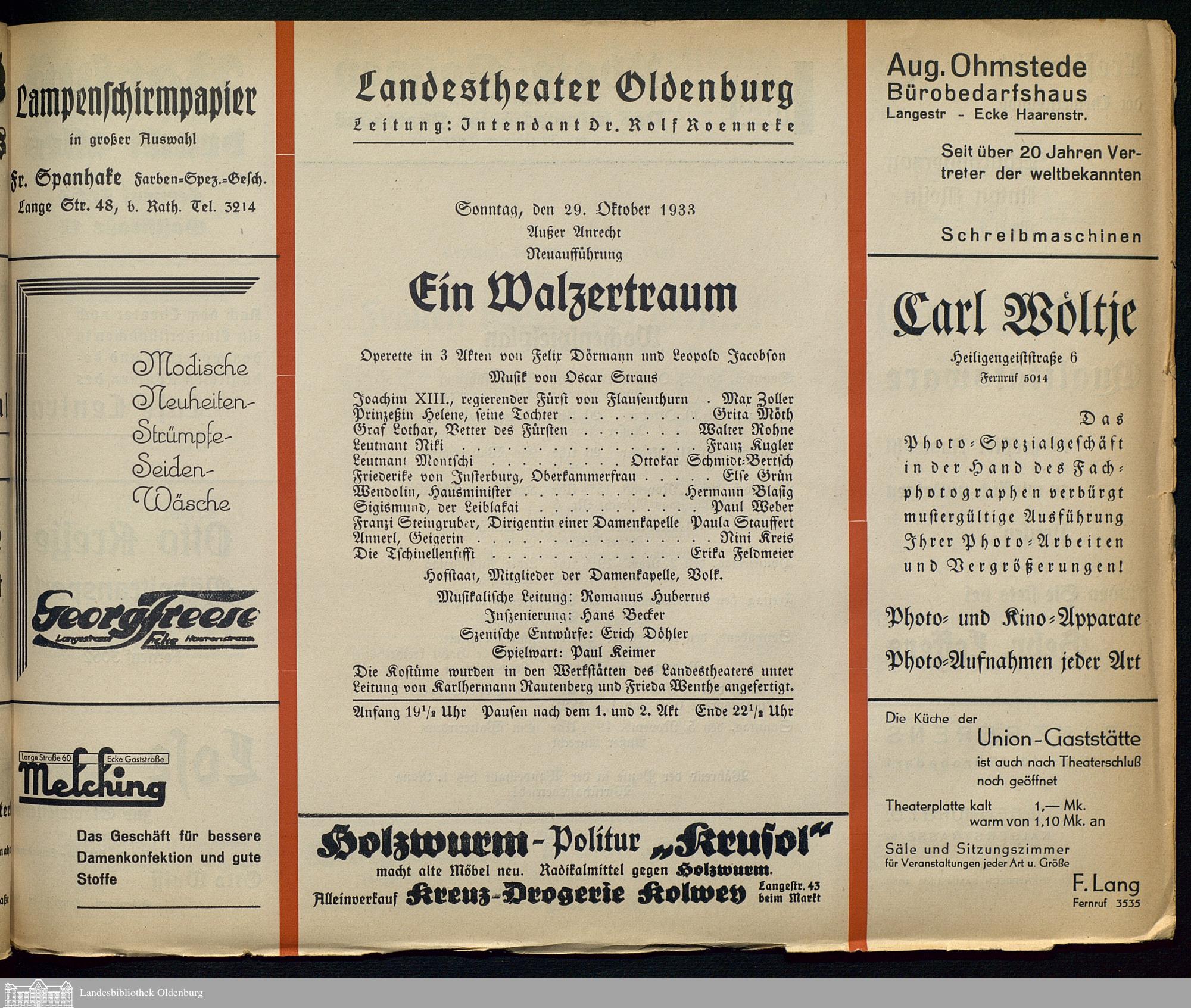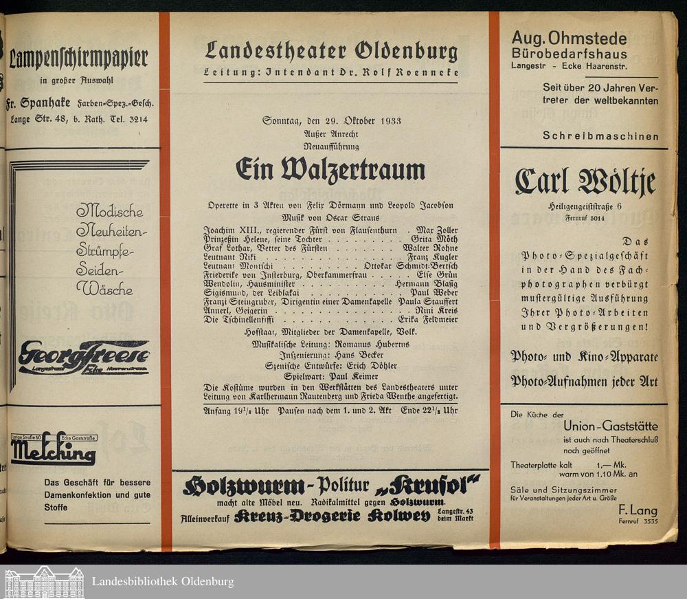 29.10.1933 - Felix Dörmann und Leopold Jacobson: Ein Walzertraum.