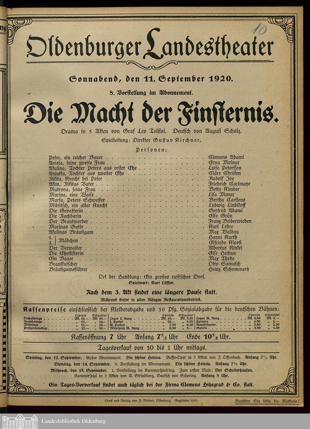 11.09.1920 - Leo Tolstoi [Lev Nikolaevič Tolstoj] / August Scholz (Bearb.): Die Macht...