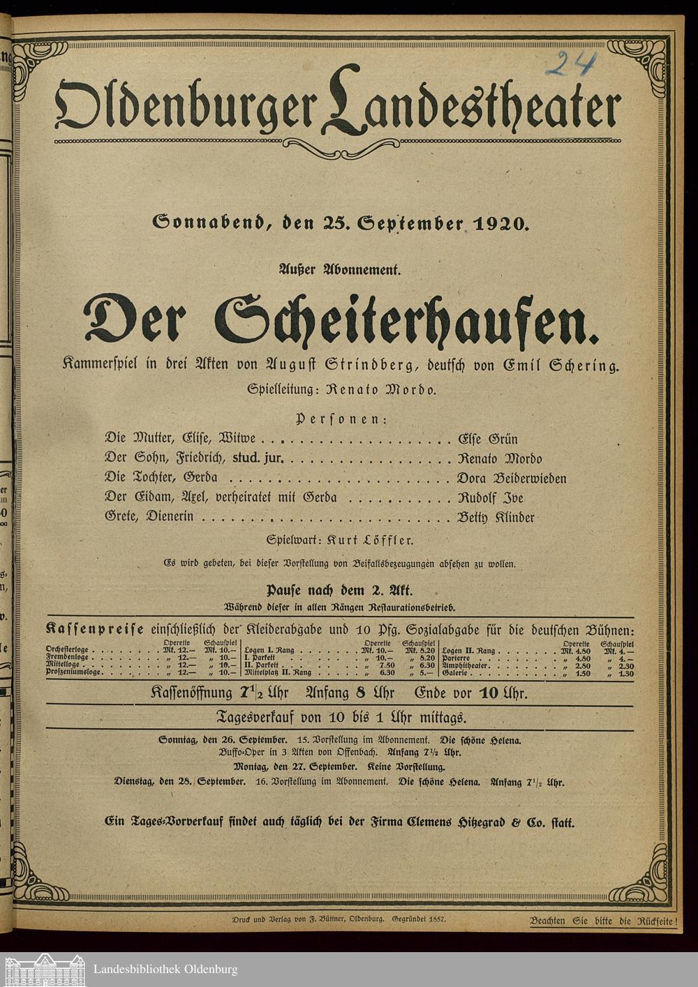 25.09.1920 - August Strindberg / Emil Schering (Bearb.): Der Scheiterhaufen.