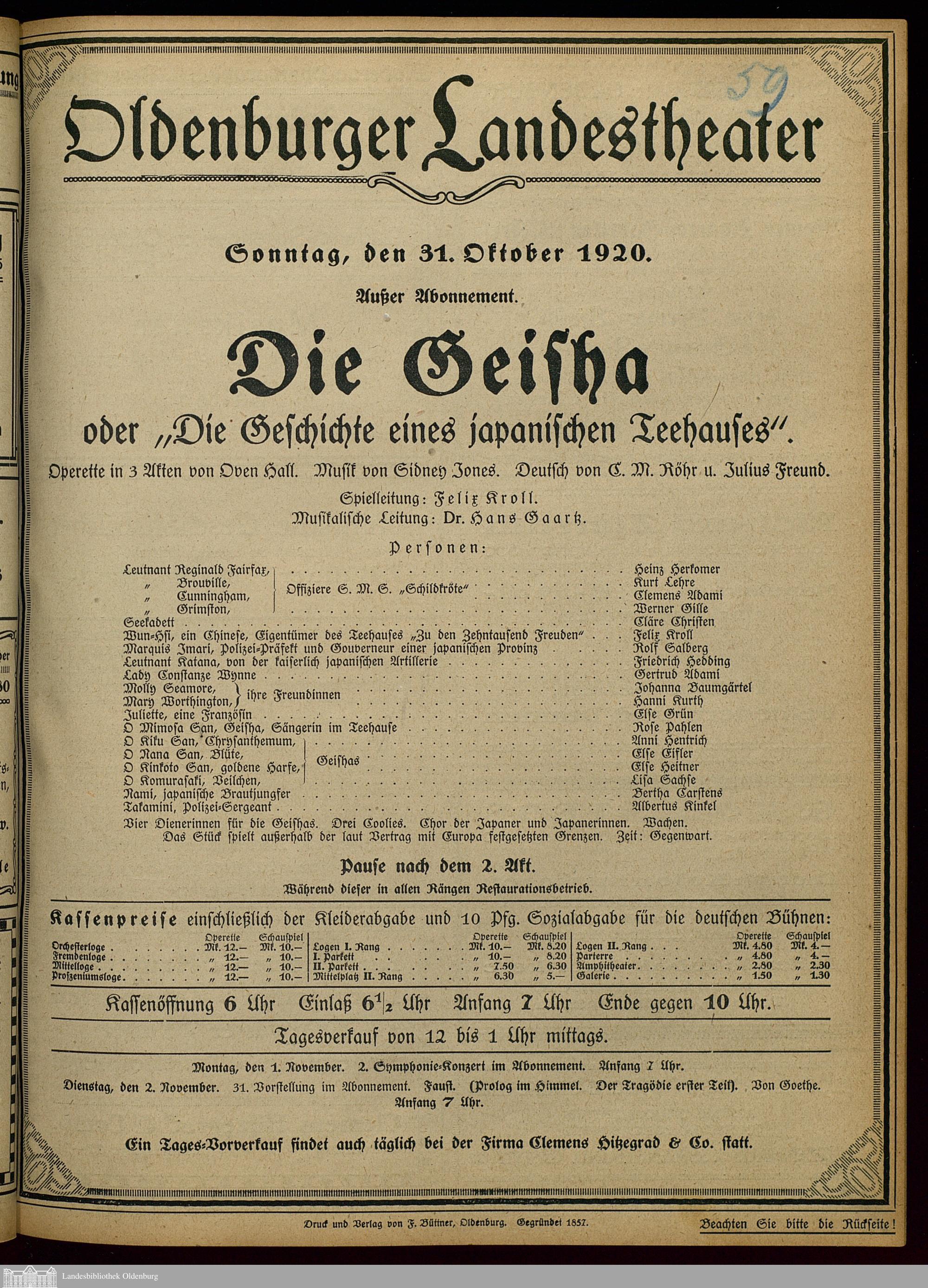 31.10.1920 - Owen Hall / Carl Max Roehr und Julius Freund (Bearb.): Die Geisha oder:...
