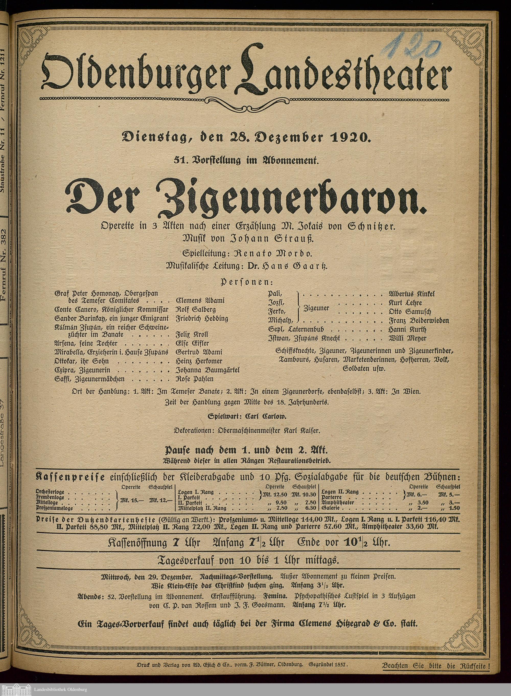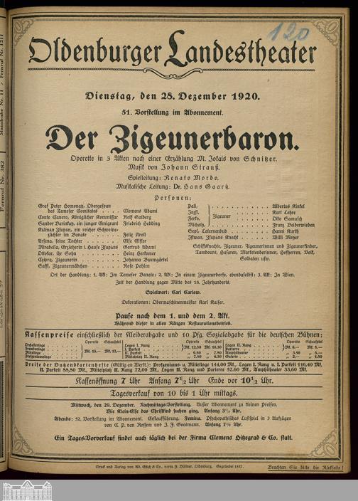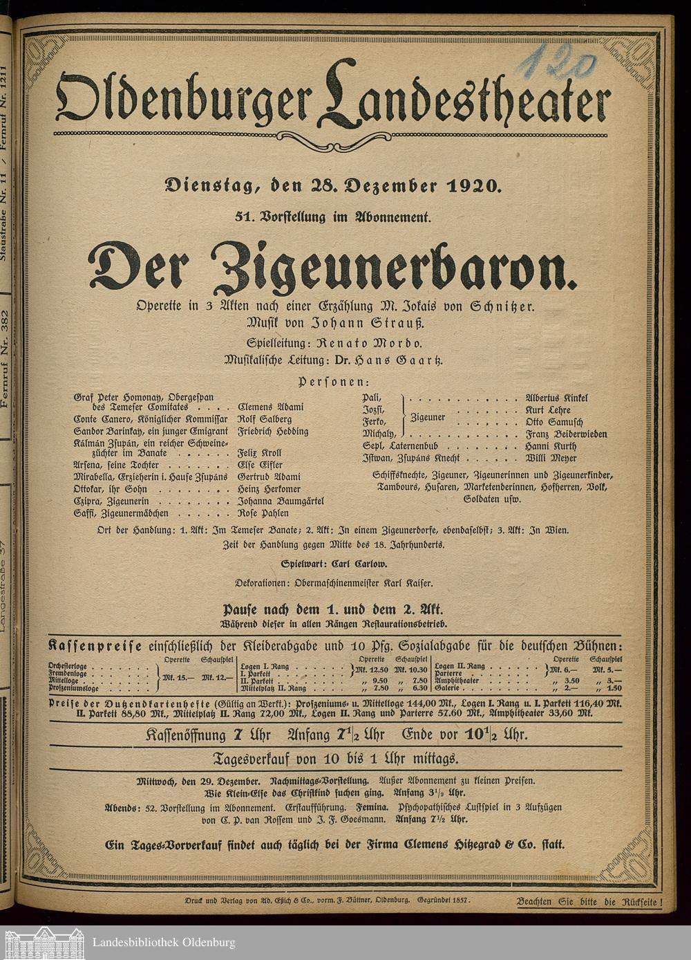 28.12.1920 - Mór Jókai / Iganz Schnitzer (Bearb.): Der Zigeunerbaron.
