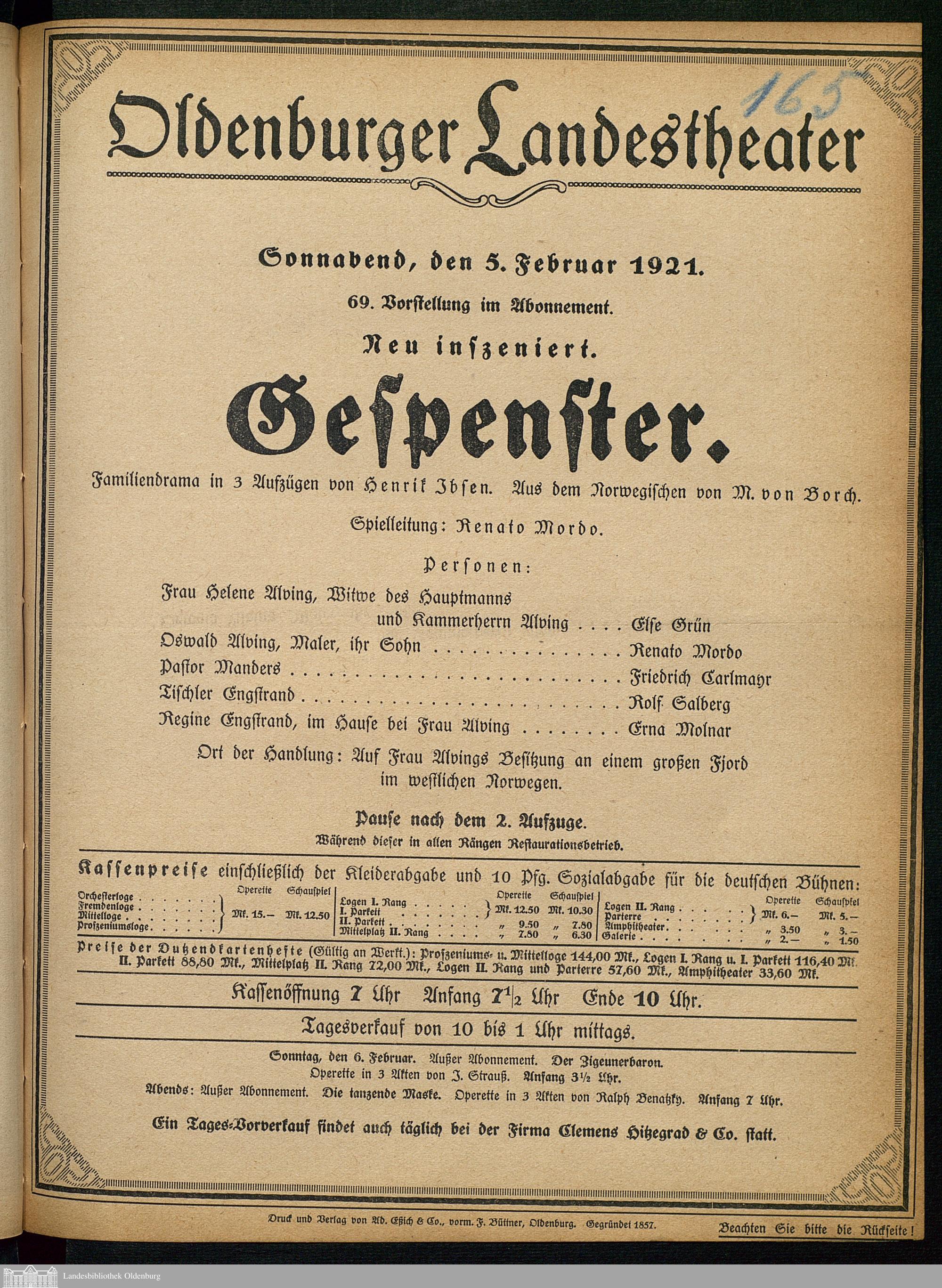 05.02.1921 - Henrik Ibsen / Marie von Borch (Bearb.): Gespenster.