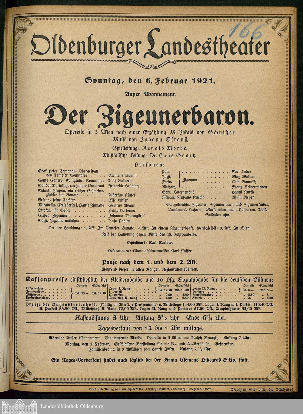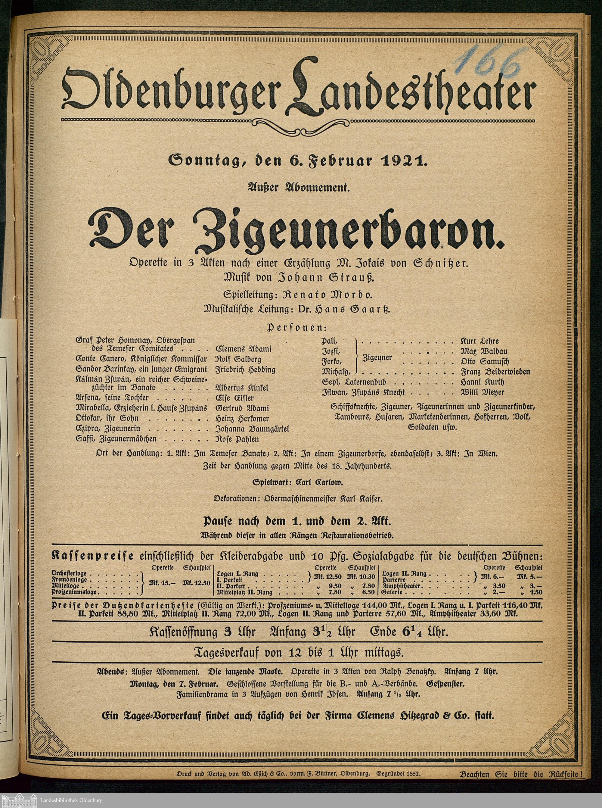 06.02.1921 - Mór Jókai / Ignaz Schnitzer: Der Zigeunerbaron.