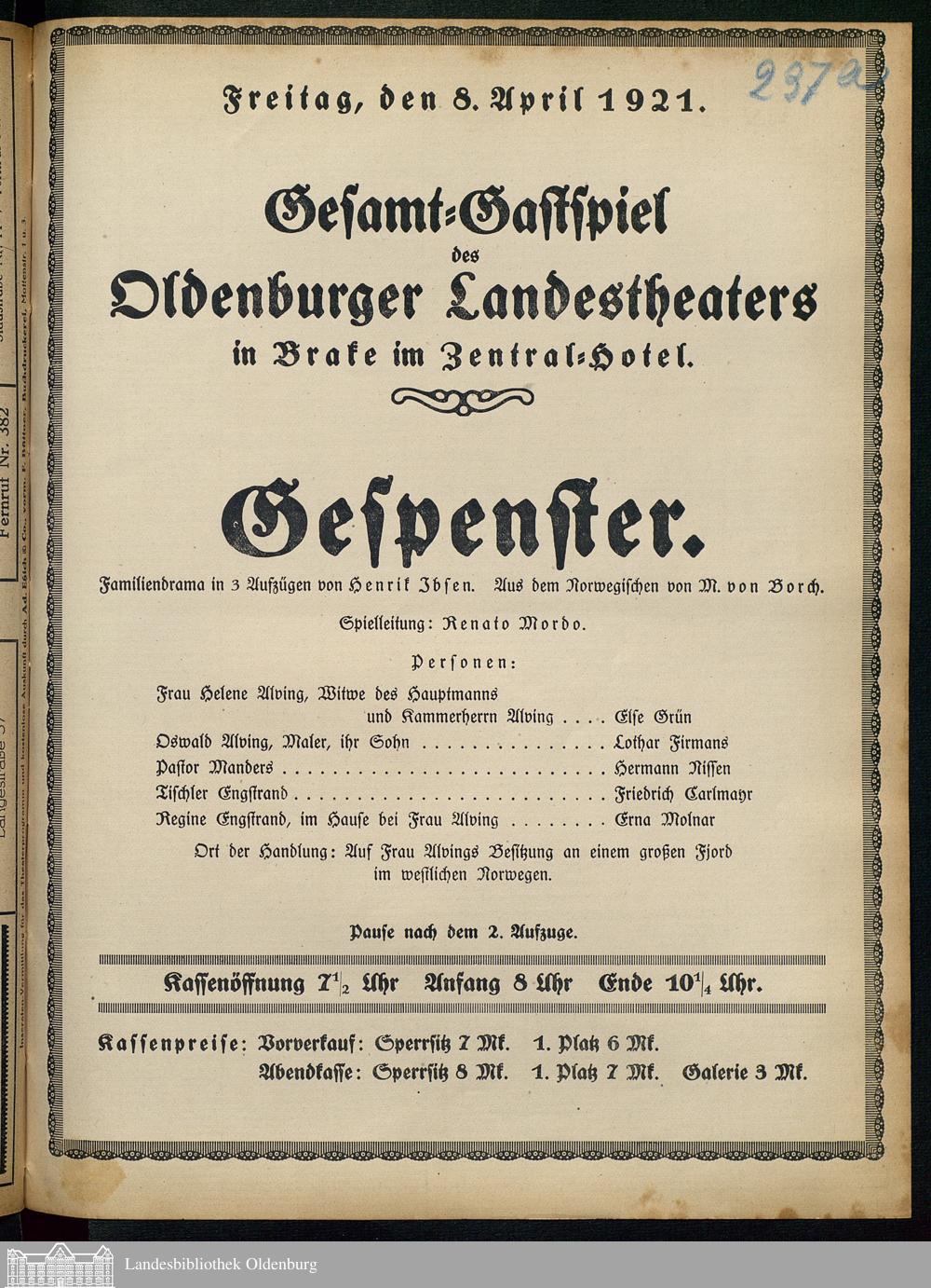 08.04.1921 - Henrik Ibsen / Marie von Borch (Bearb.): Gespenster. [Gastspiel in ...